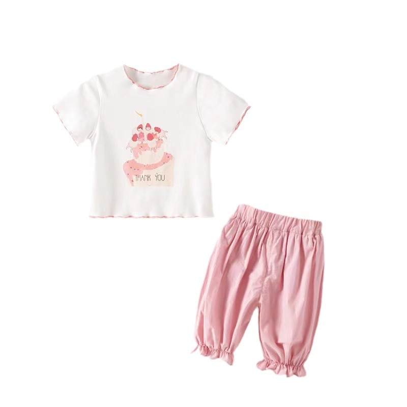 夏季女童套装宝宝洋气儿童个性潮牌韩版木耳边卡通T恤七分灯笼裤