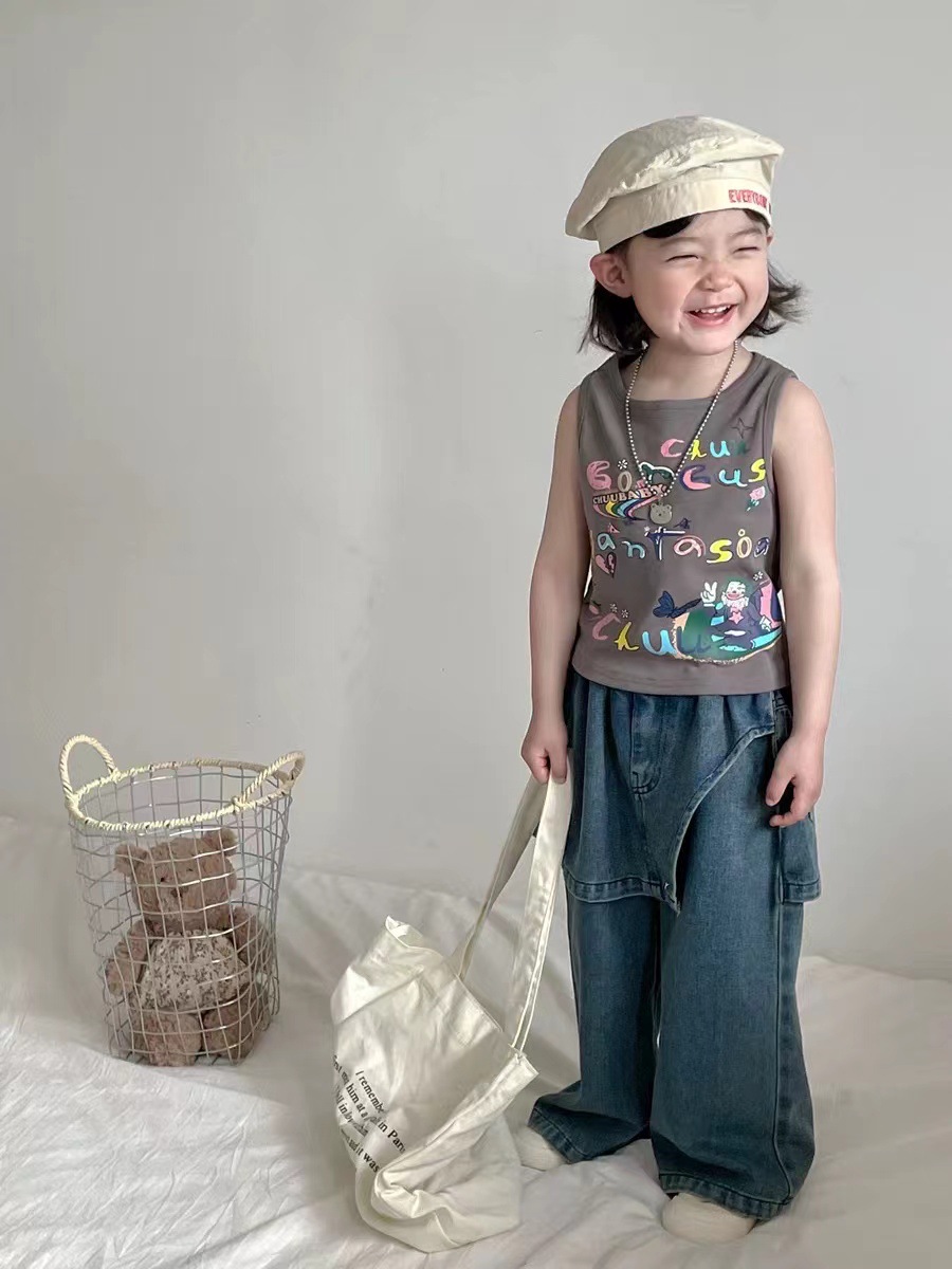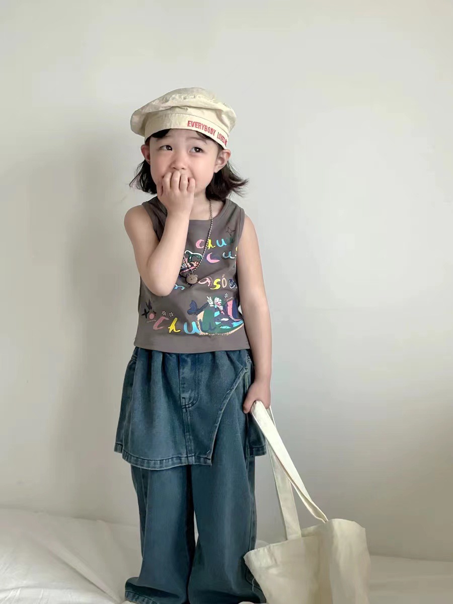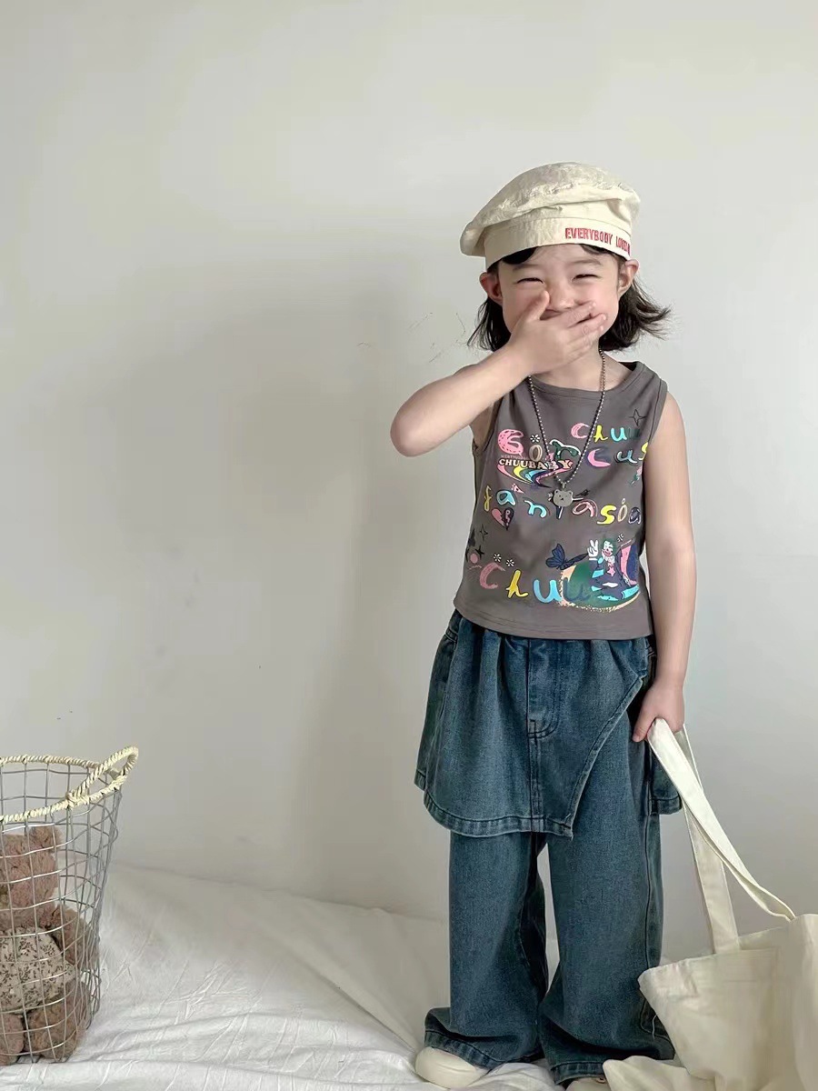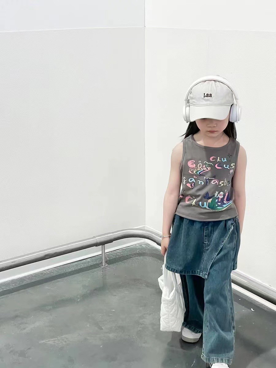 夏季女童套装宝宝洋气儿童个性潮网红韩版卡通背心牛仔裙裤阔腿裤