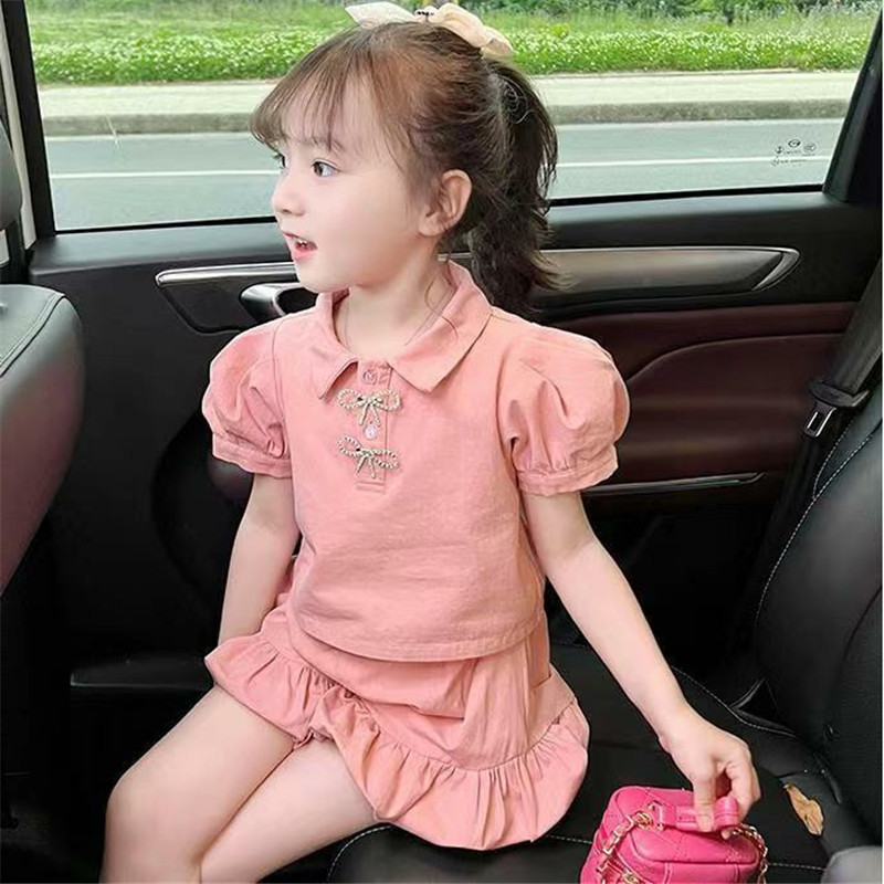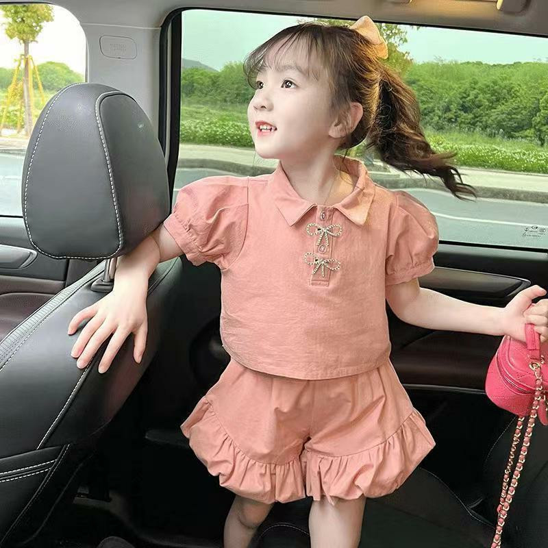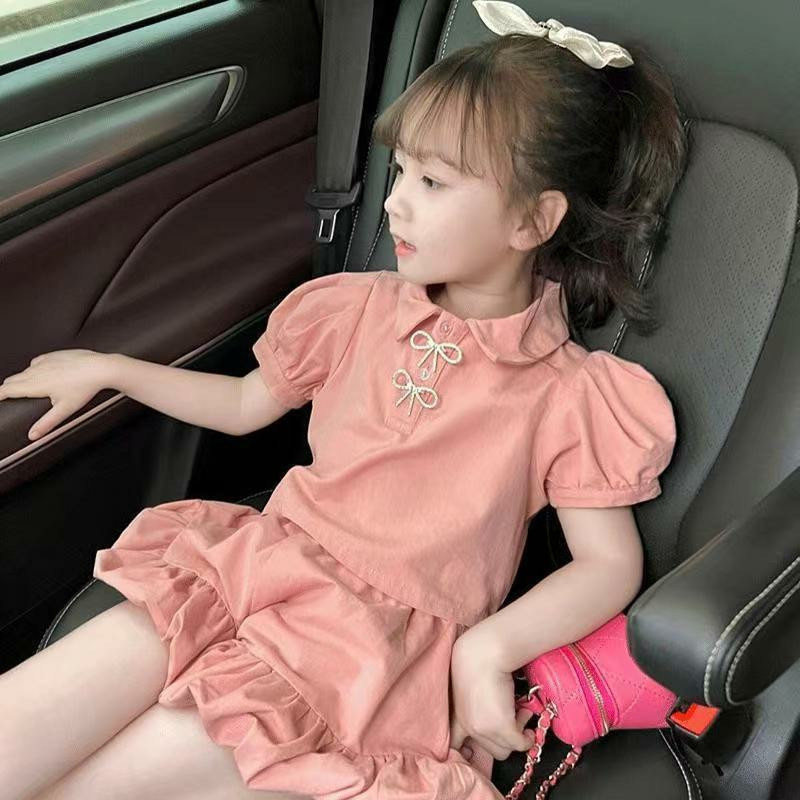 夏季女童套装宝宝洋气儿童个性潮网红韩版翻领泡泡袖T恤花苞短裤