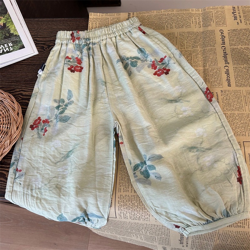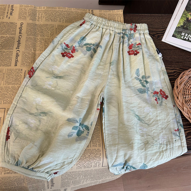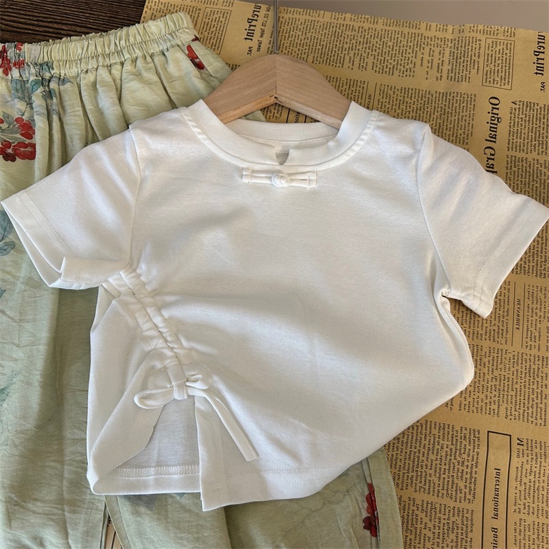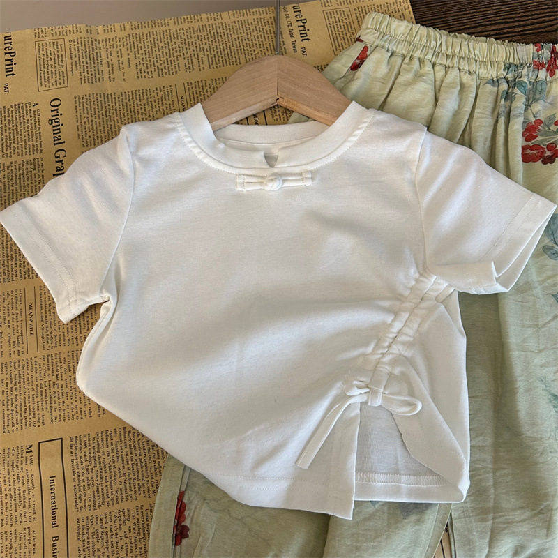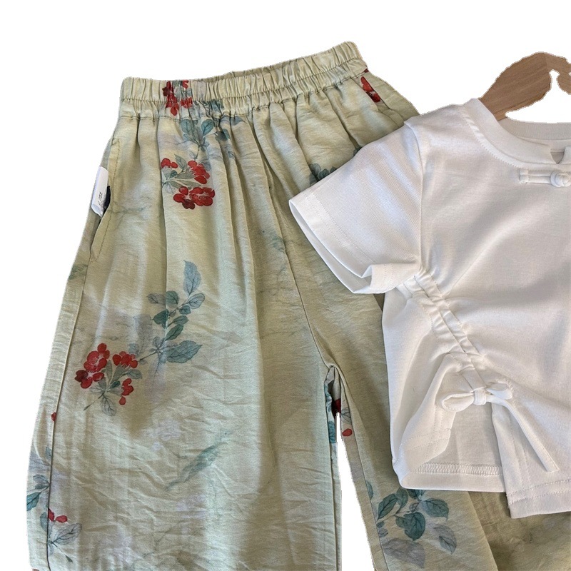夏季女童套装宝宝洋气儿童个性潮牌中国风盘口抽绳T恤花朵灯笼裤