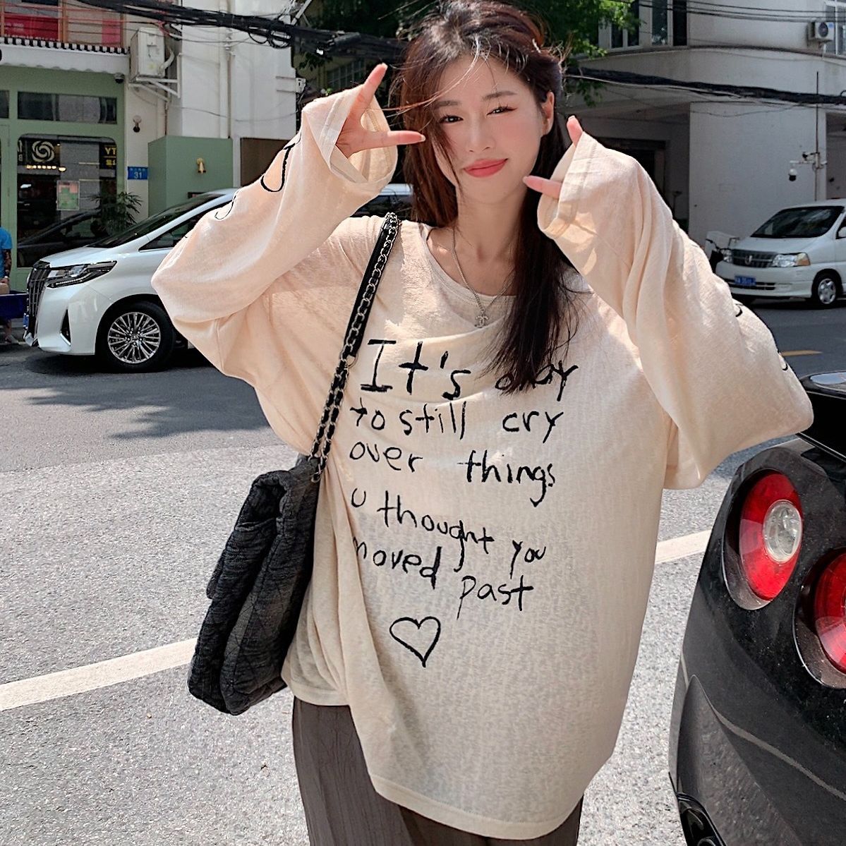 螺纹字母爱心印花防晒T恤女夏新款长袖薄款宽松显瘦度假空调罩衫