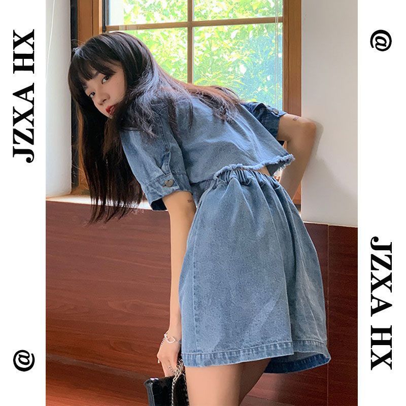 春夏新款牛仔连衣裙大码胖mm显瘦收腰辣妹穿搭短袖a字短裙女