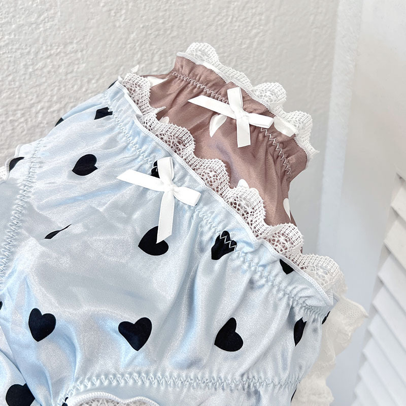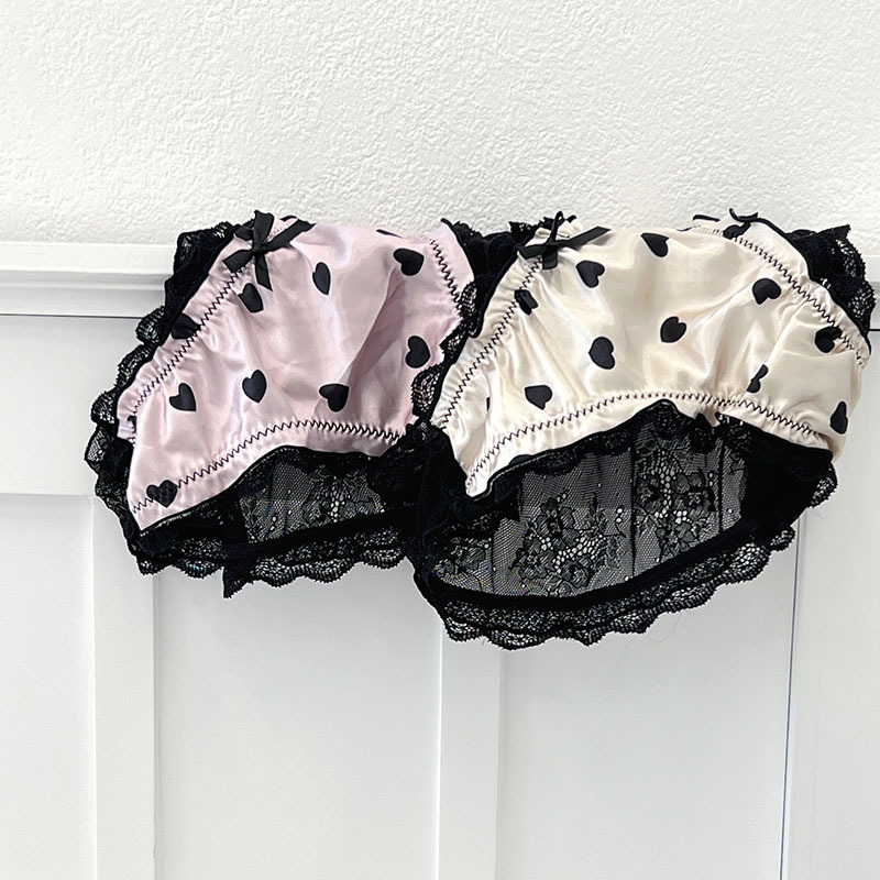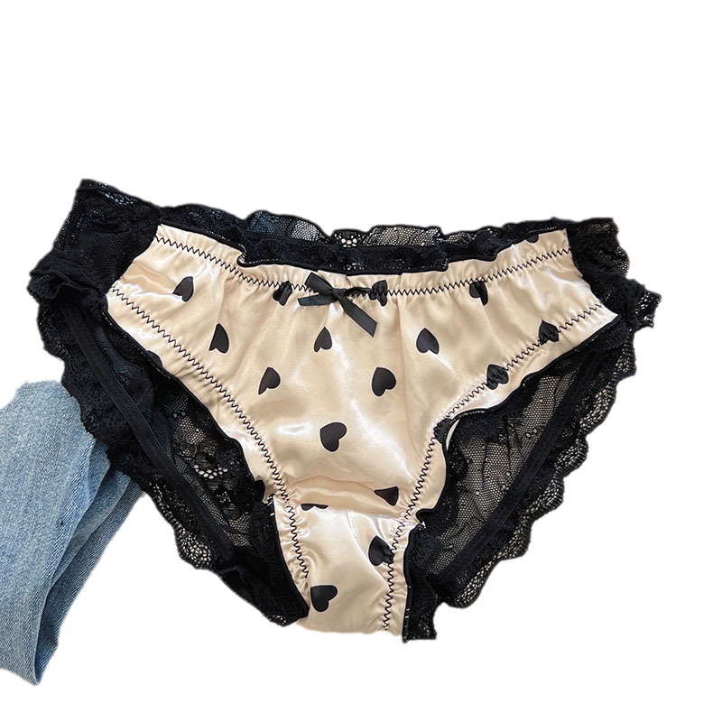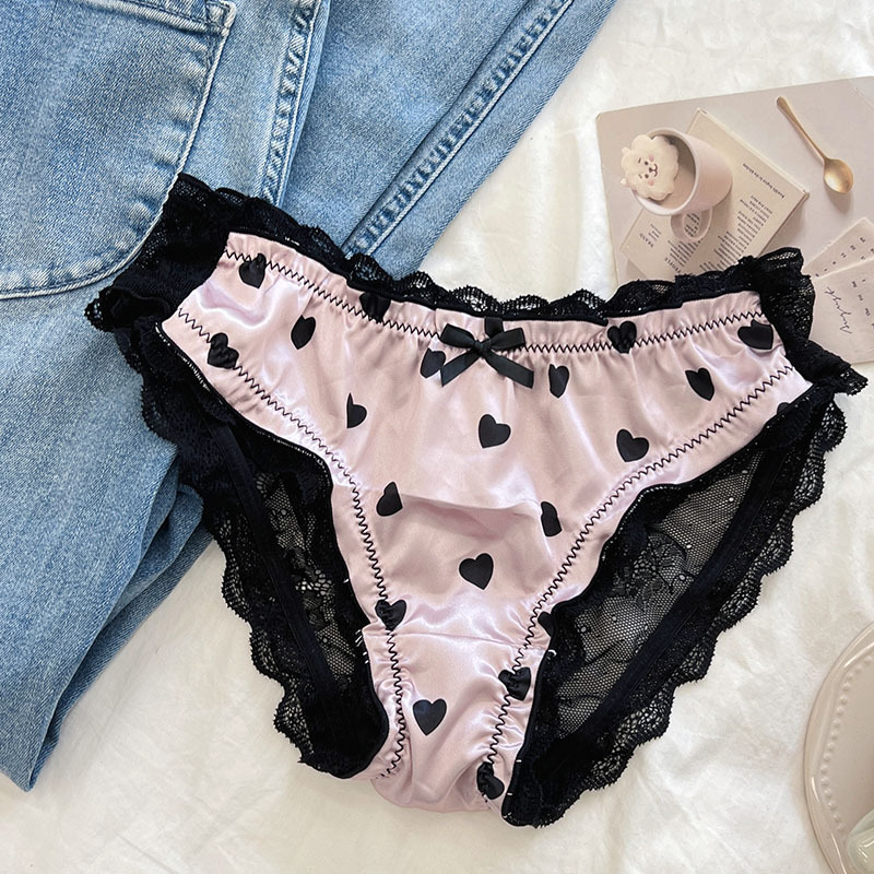 日系纯欲风缎面蕾丝内裤女低腰提臀甜美少女爱心性感三角裤头棉档