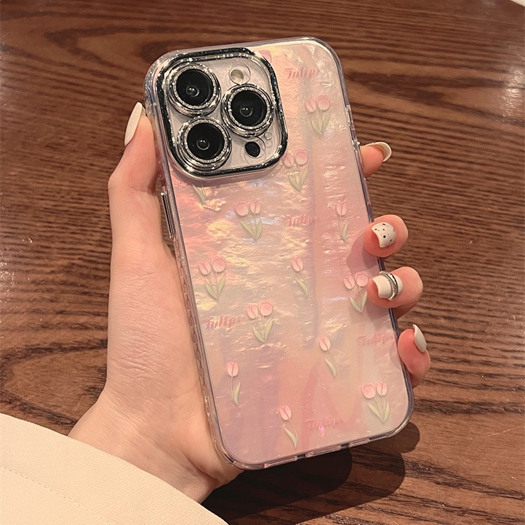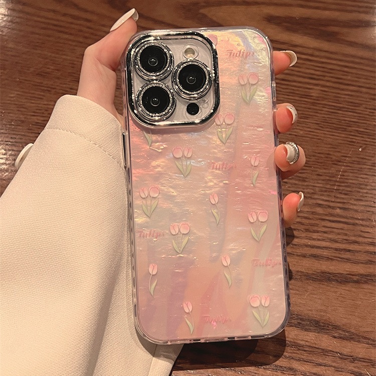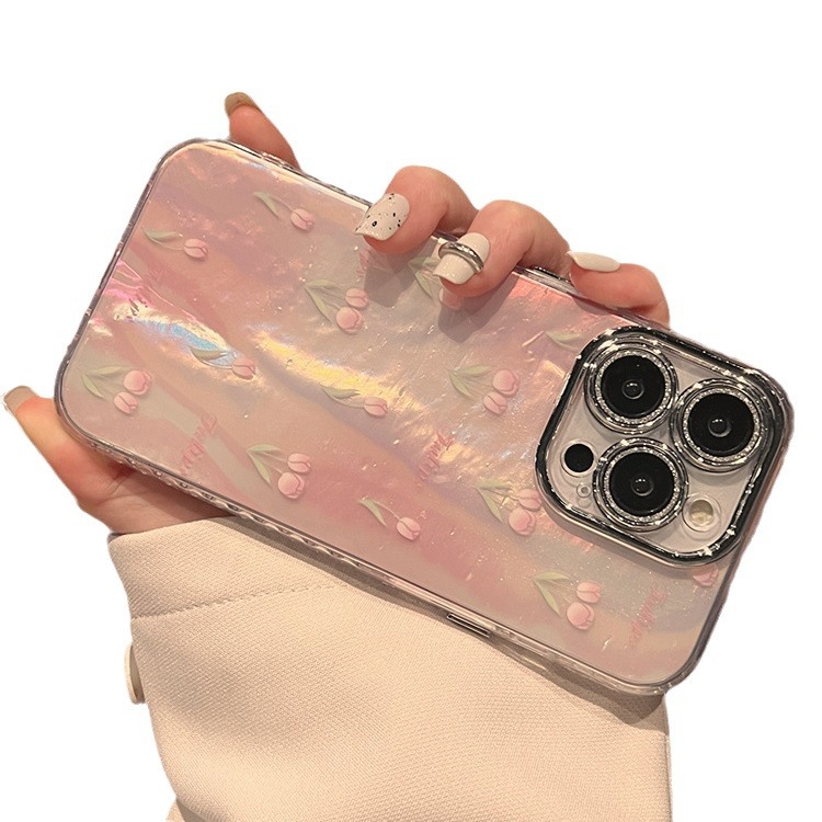 银镜贝壳纹粉郁金香适用iPhone15promax苹果14手机壳13全包12新款