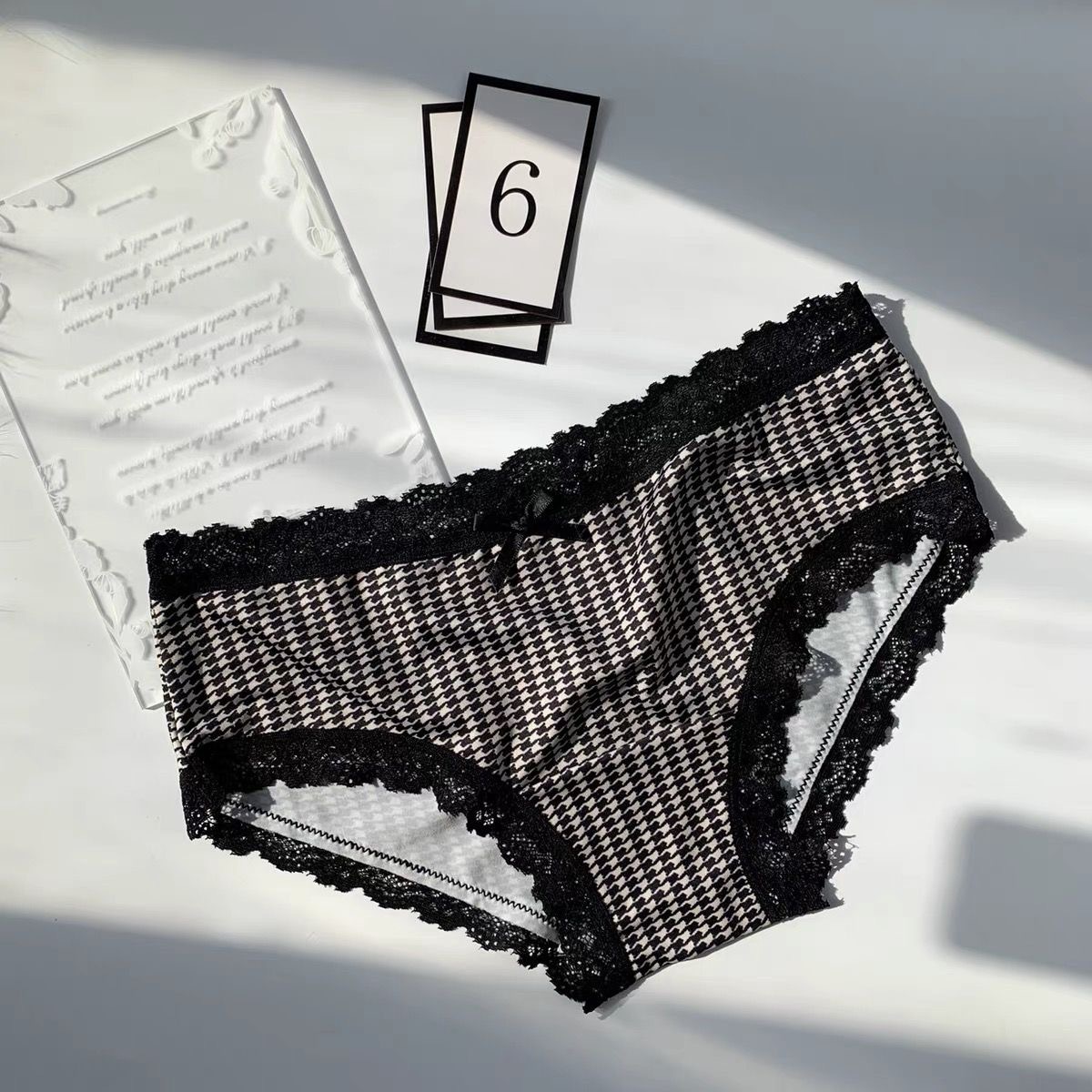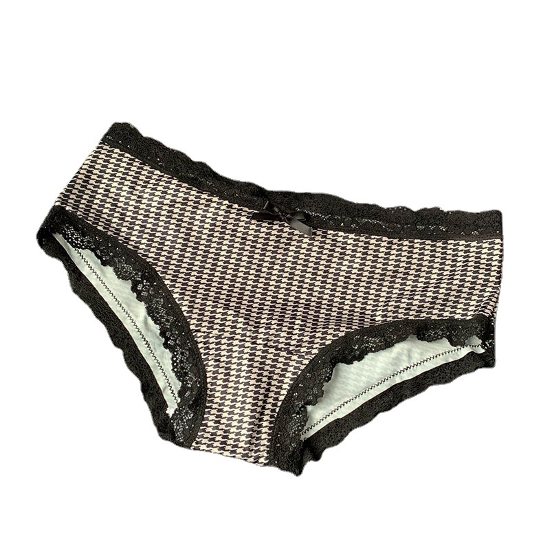 新品日系奢华千鸟格子内裤女低腰蕾丝边蝴蝶结丝滑少女三角裤无痕