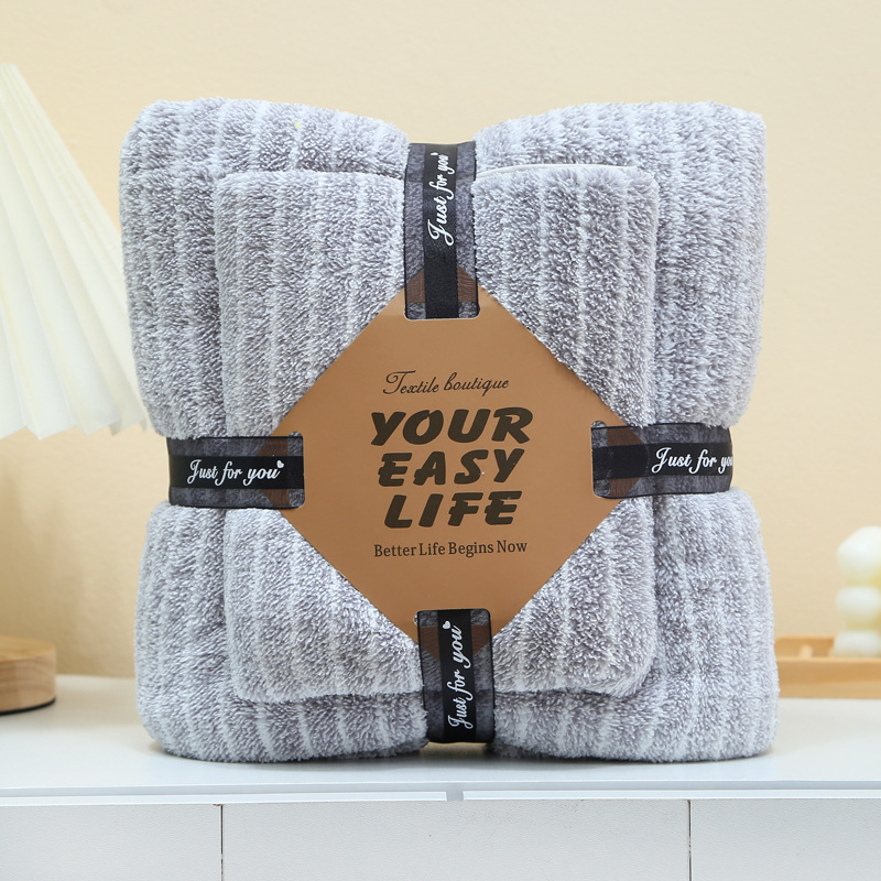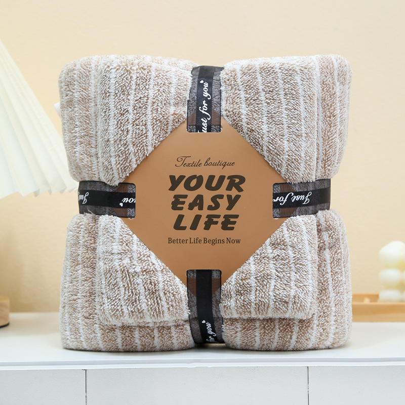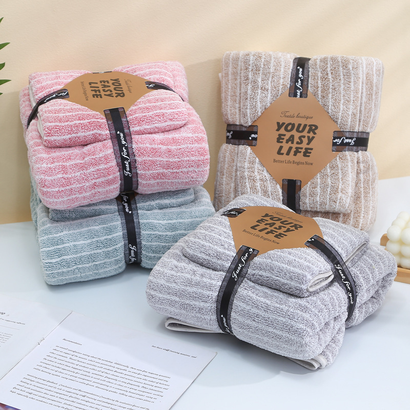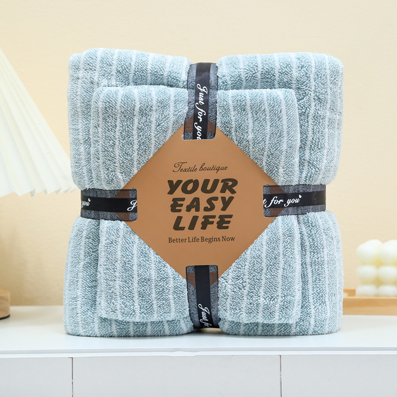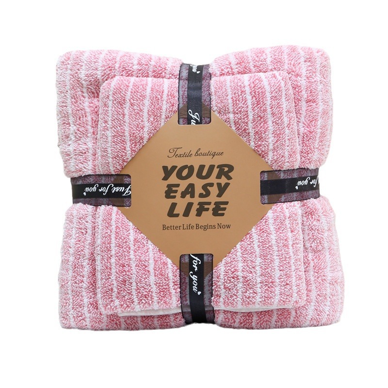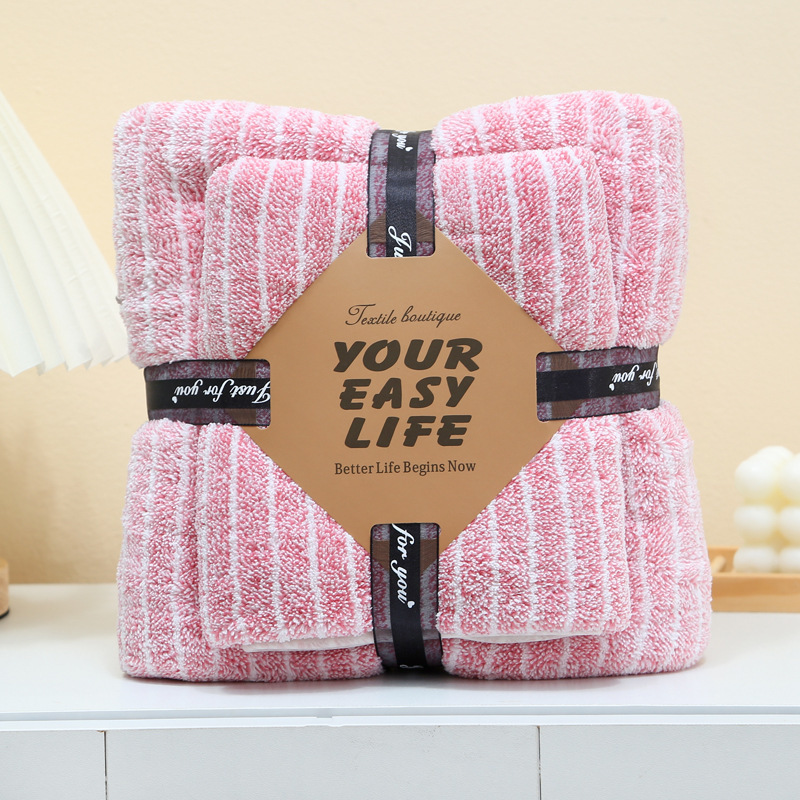 珊瑚绒细条纹毛巾浴巾两件套装家用婚庆子母套巾