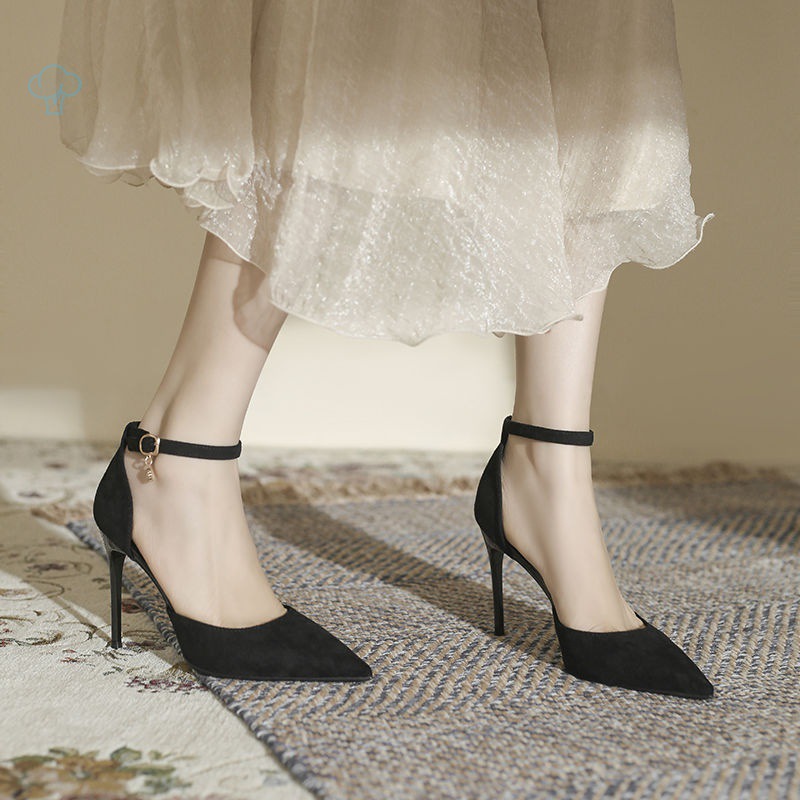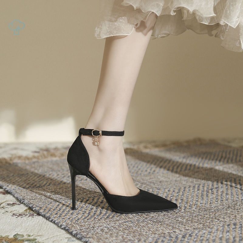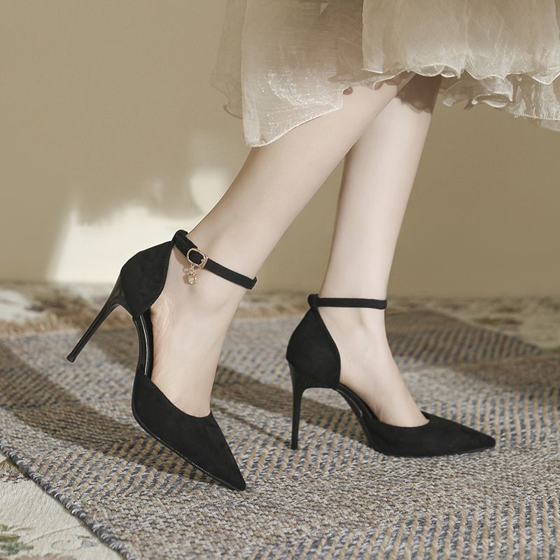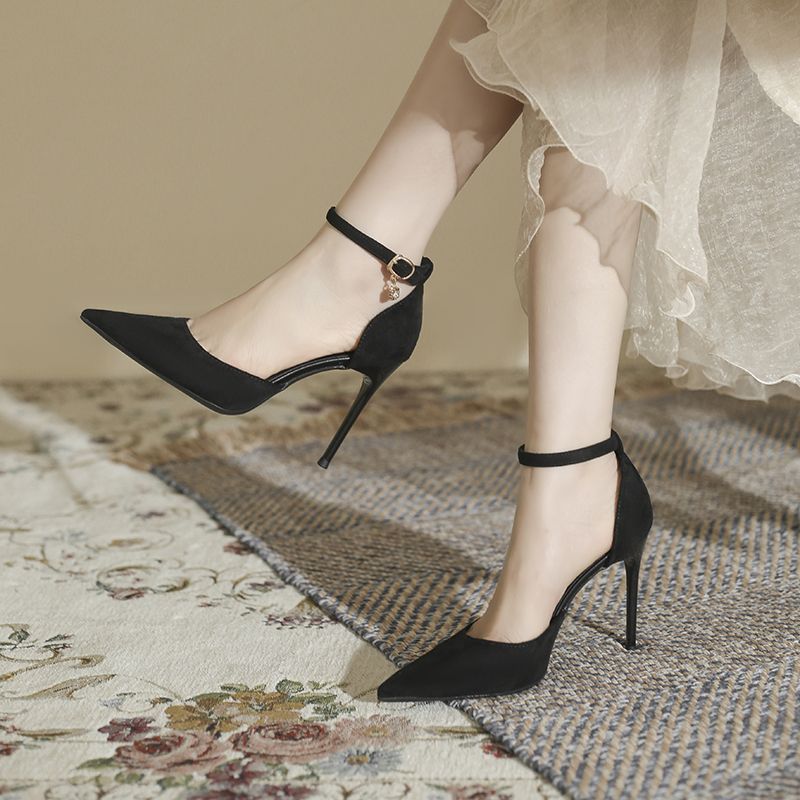 高跟鞋 纯欲 御姐黑色尖头中空女4243一字带凉鞋大码法式小码
