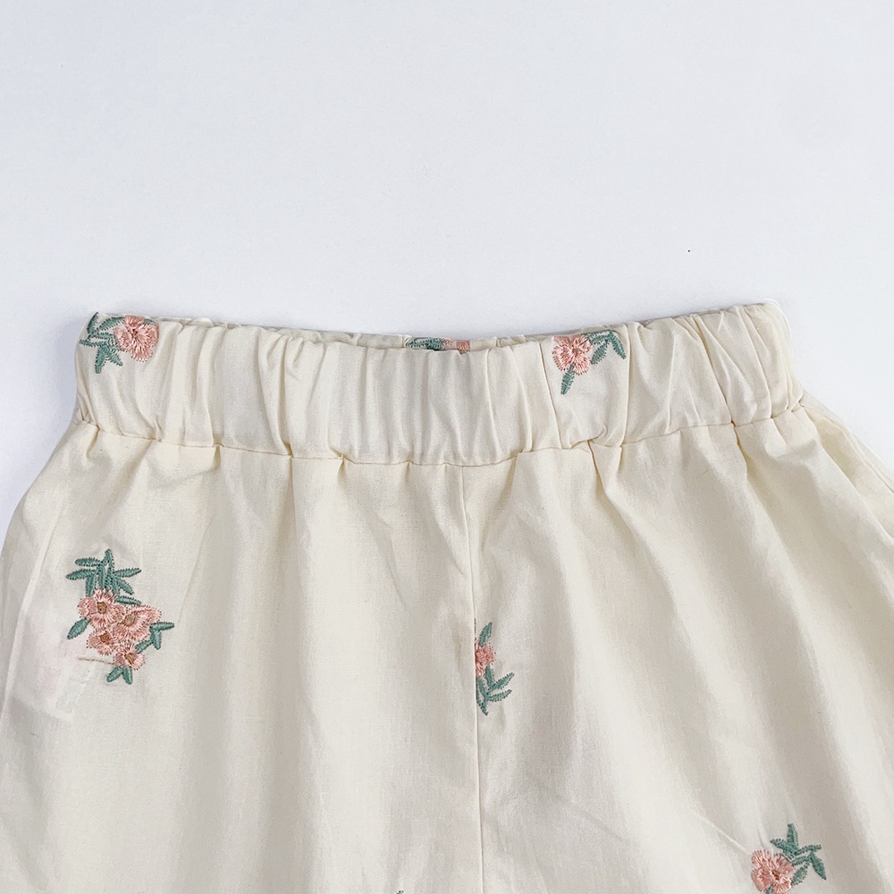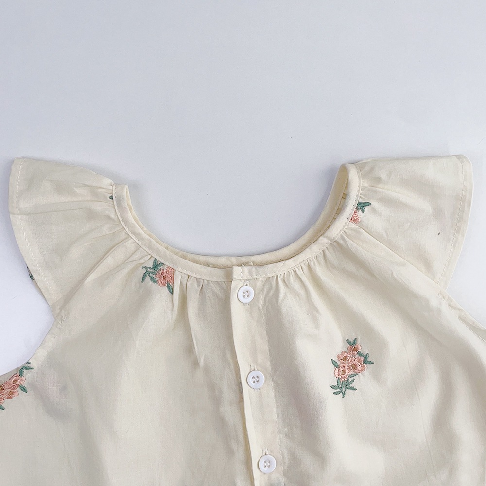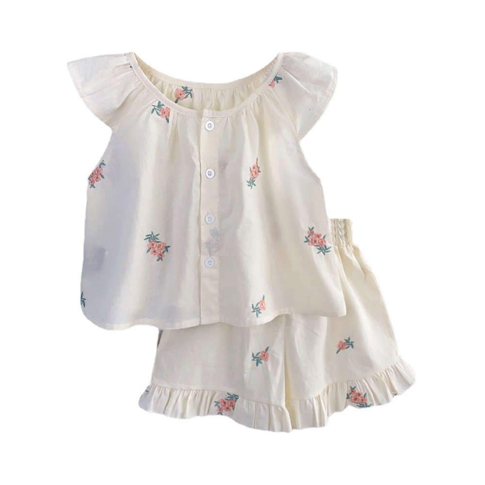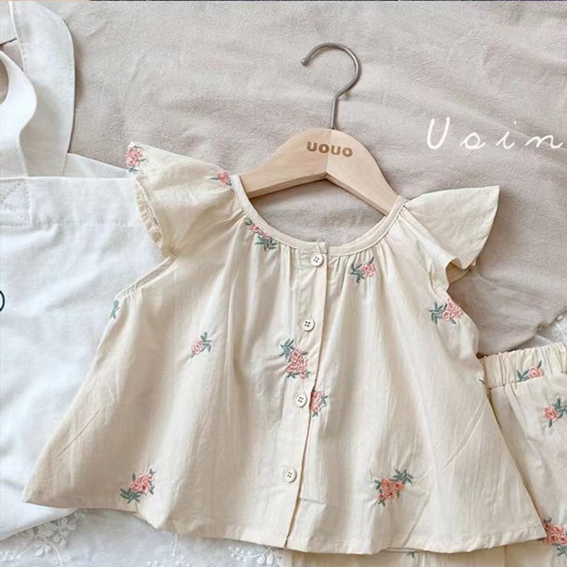 夏季女童套装宝宝洋气儿童个性潮韩版刺绣花朵飞袖衬衫木耳边短裤