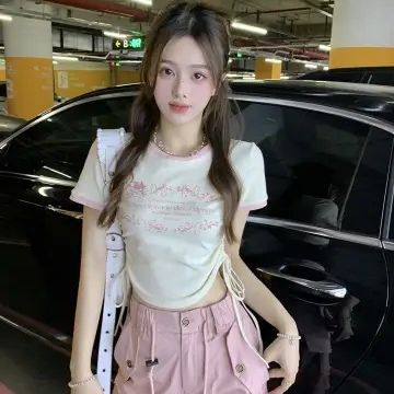 螺纹夏季露肚脐圆领正肩短袖t恤女美式甜辣小众设计感短款显瘦