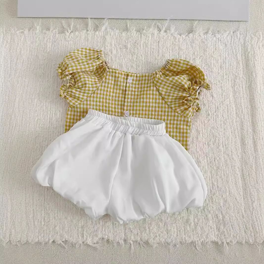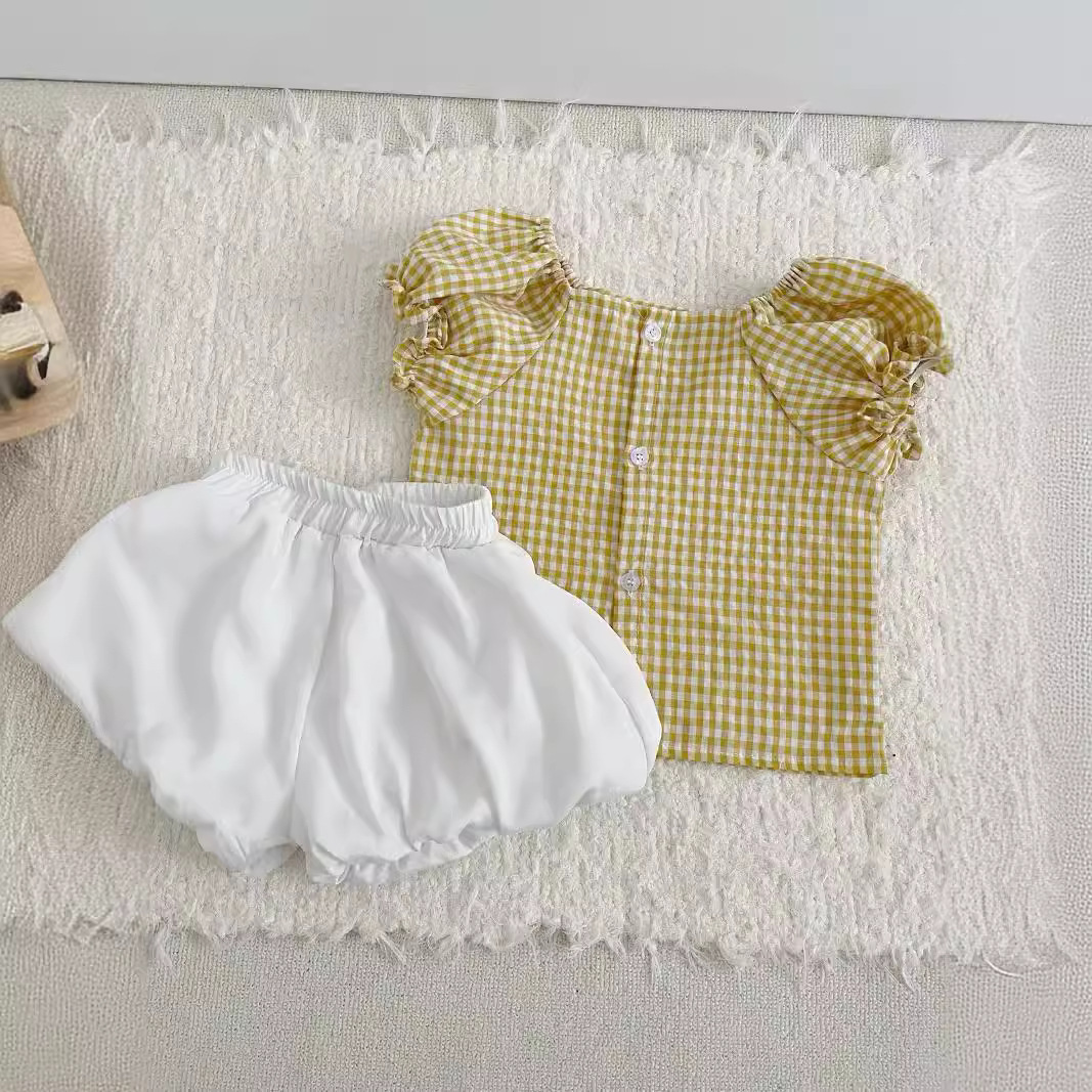 夏季女童套装宝宝洋气儿童个性潮牌可爱韩版格子娃娃衬衫花苞短裤