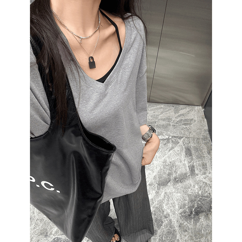 慵懒男友风宽松深V领半袖T恤女夏季休闲中长款大版百搭纯色上衣潮
