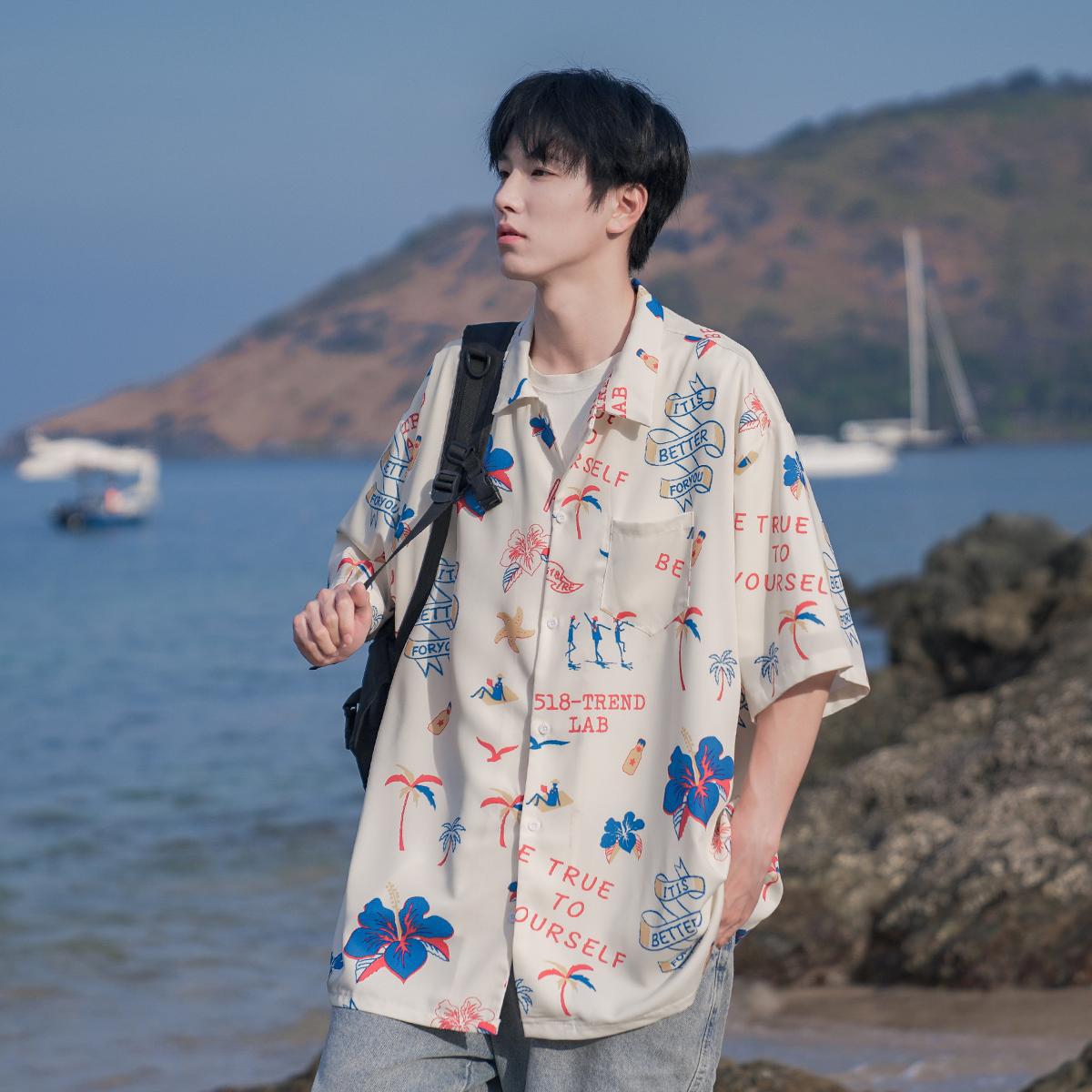 花衬衫男生夏季新款港风海边痞帅高级感短袖度假沙滩夏威夷风衬衣
