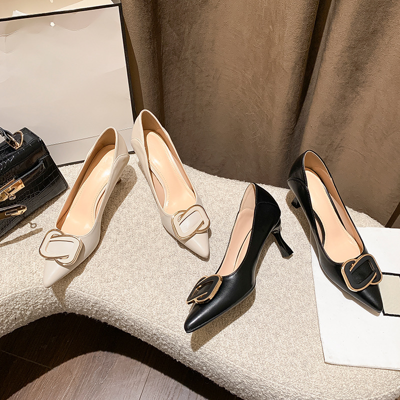 新款方扣高跟鞋女细跟尖头两穿大码浅口法式秋季黑色单鞋
