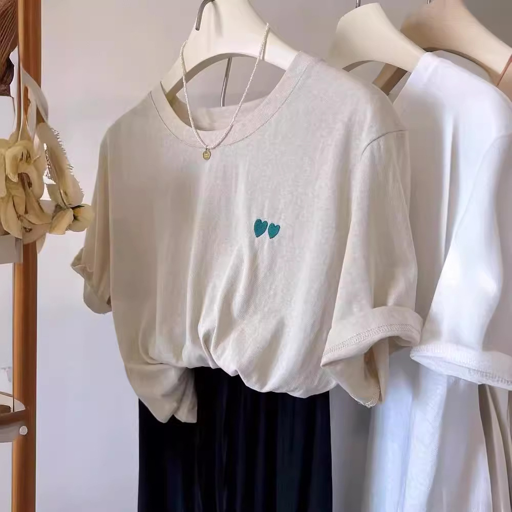轻薄透气雪花棉爱心刺绣T恤女宽松休闲百搭圆领短袖上衣夏季新款