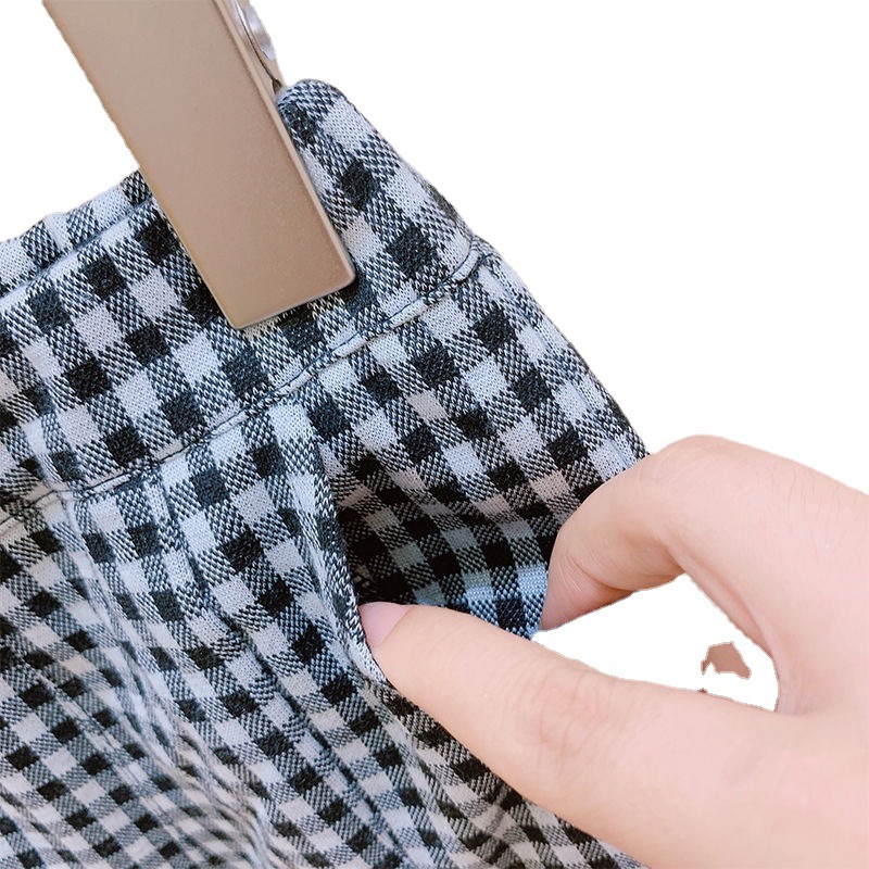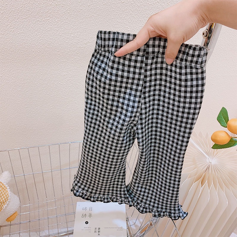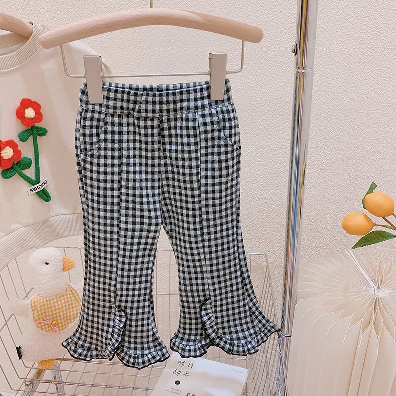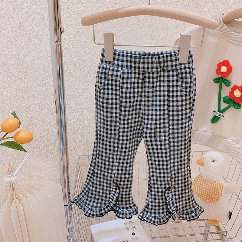 春秋女童装休闲裤宝宝洋气儿童个性潮韩版格子花边开叉网红喇叭裤