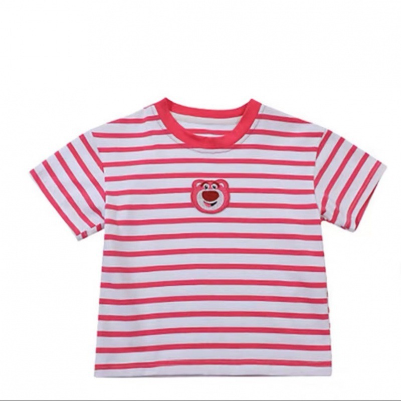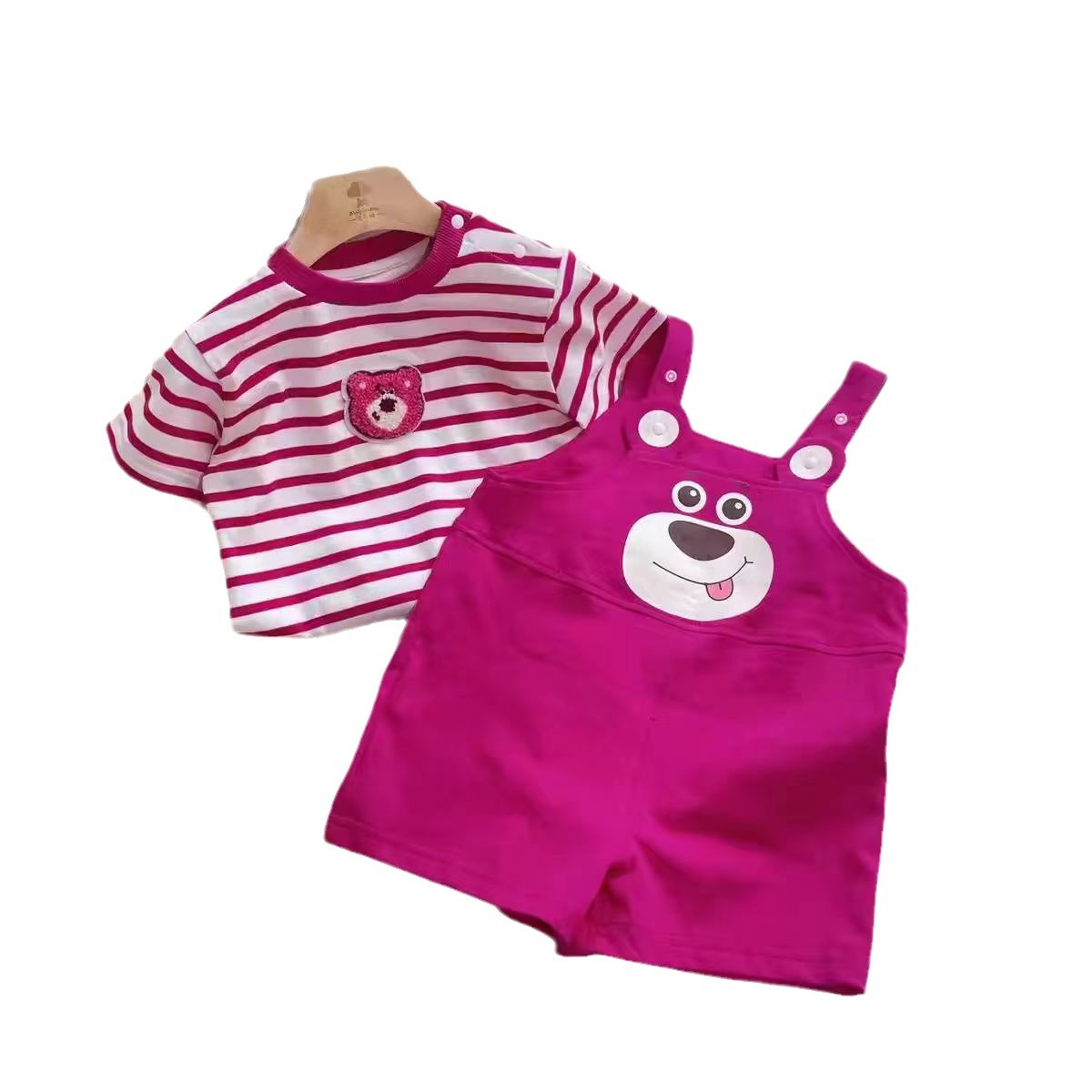 夏季女童套装宝宝洋气儿童个性潮牌外贸条纹卡通草莓熊T恤背带裤