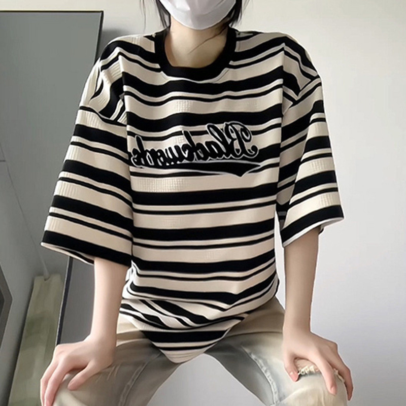 日系ins潮休闲华夫格复古条纹短袖t恤女情侣闺蜜上衣