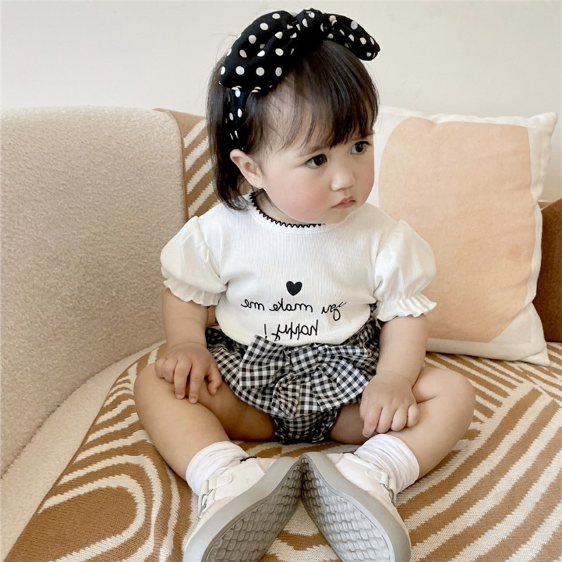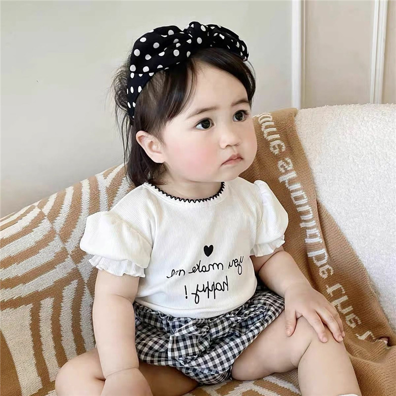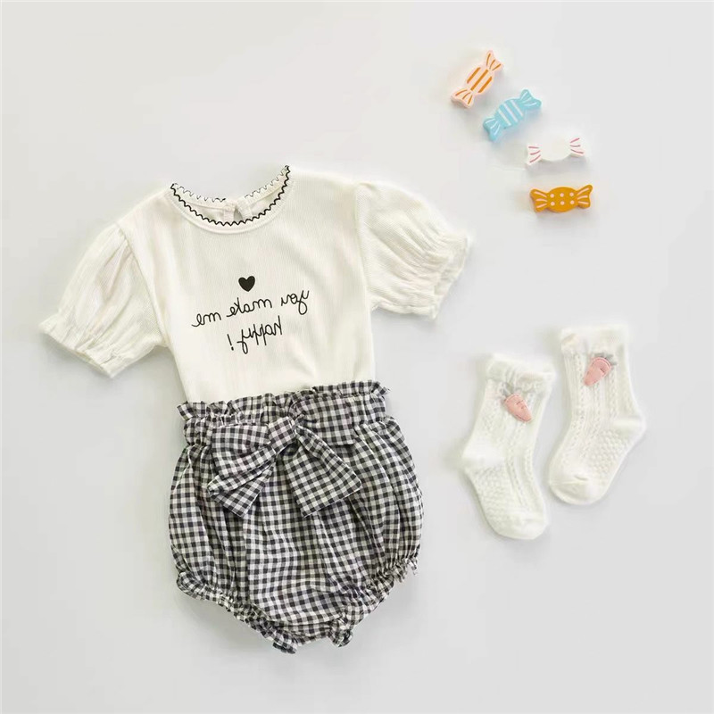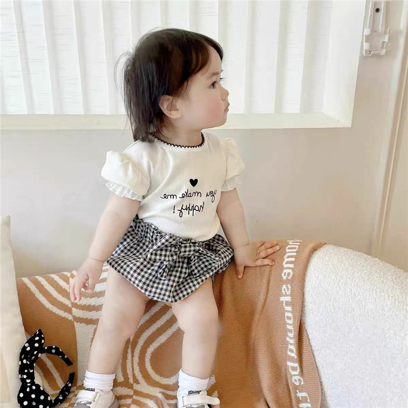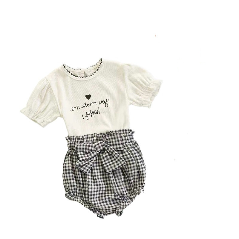 夏季女童套装宝宝网红洋气儿童个性潮牌韩版泡泡袖T恤格子花苞裤