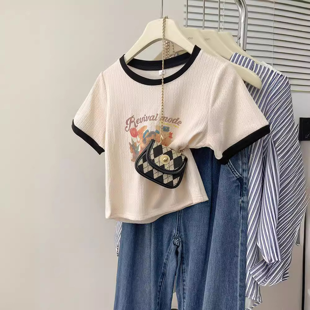 休闲美式短款T恤女短袖2025新款爆款小众设计感宽松正肩上衣夏季