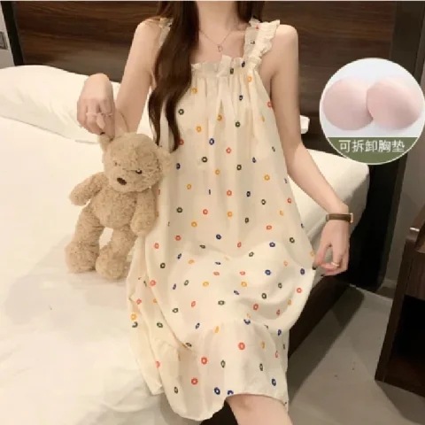 带胸垫睡衣女夏季新款吊带睡裙皱布家居服甜美可爱网红可外穿
