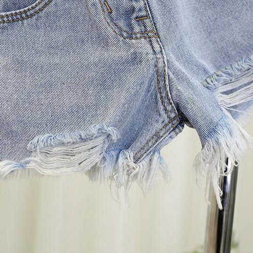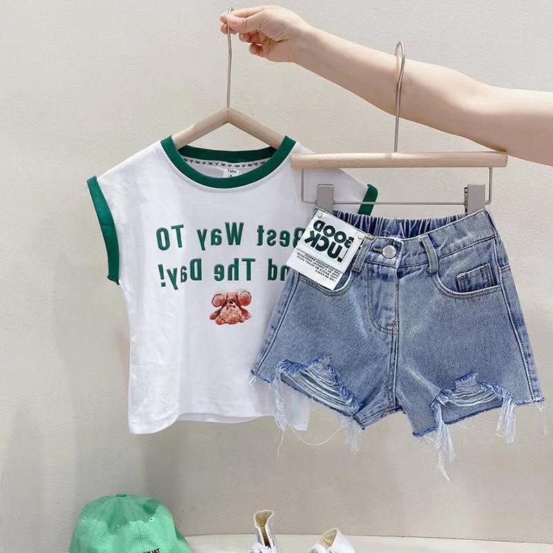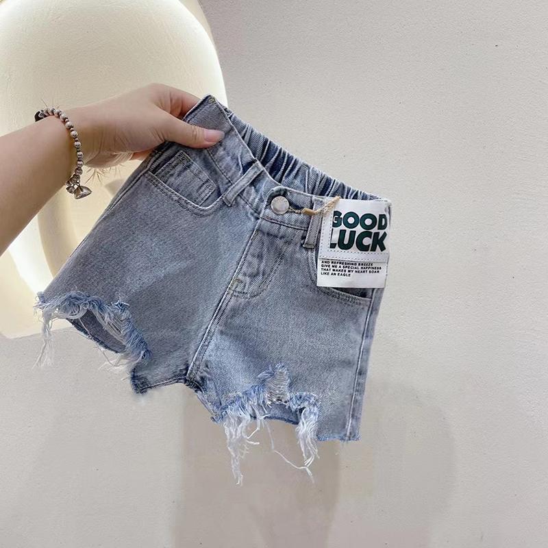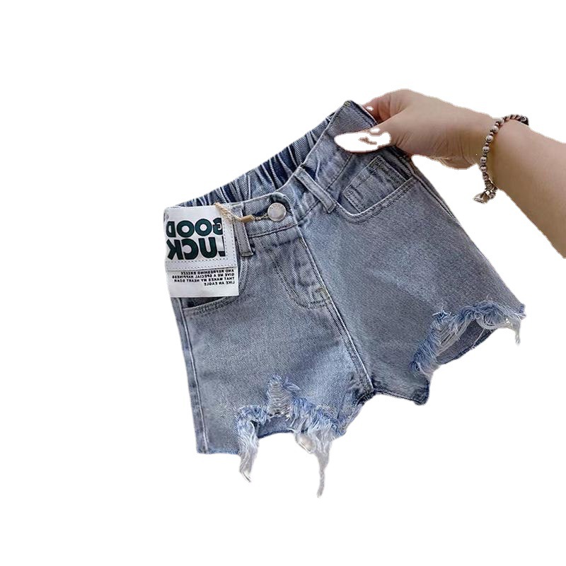 夏季女童牛仔短裤宝宝洋气儿童个性潮牌韩版字母贴布破洞毛边热裤