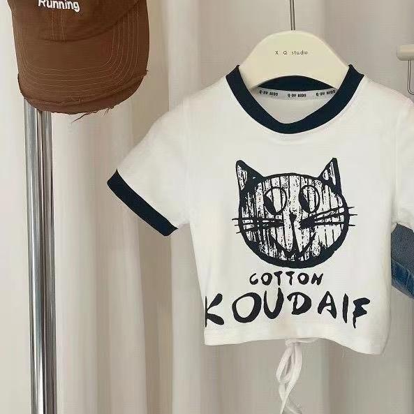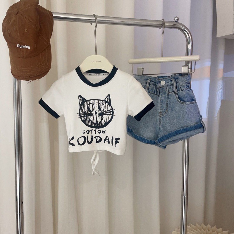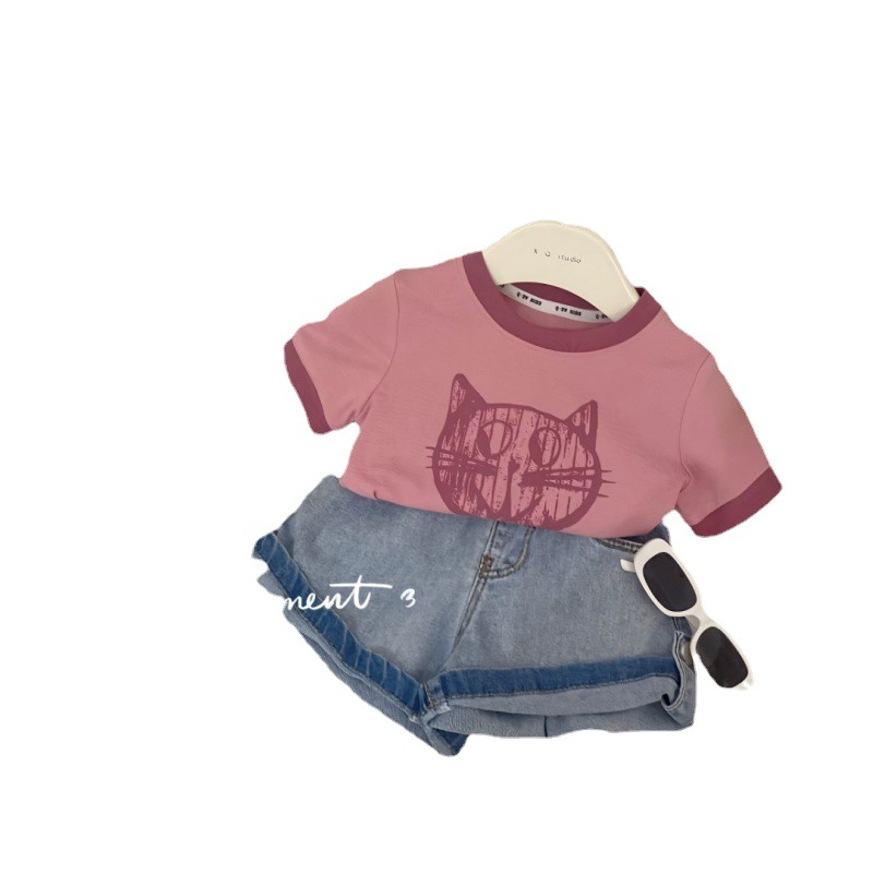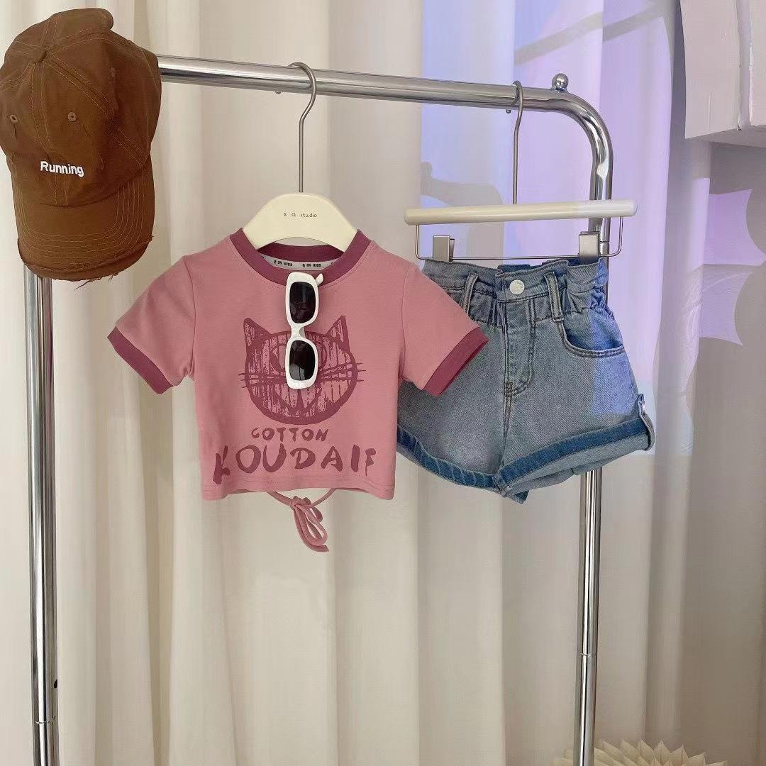 夏季女童套装宝宝洋气儿童个性潮牌韩版卡通拼色T恤牛仔短裤热裤