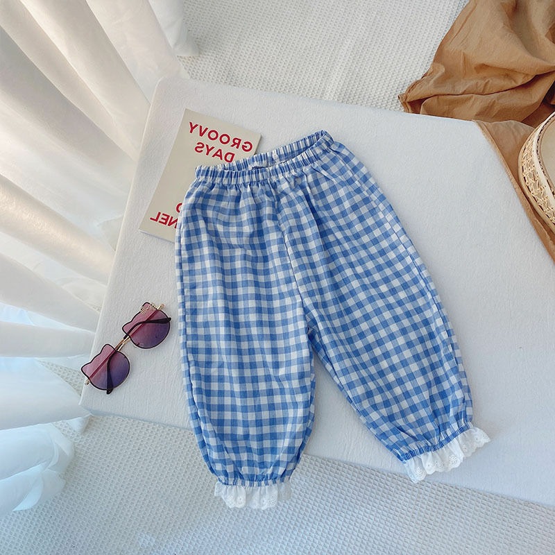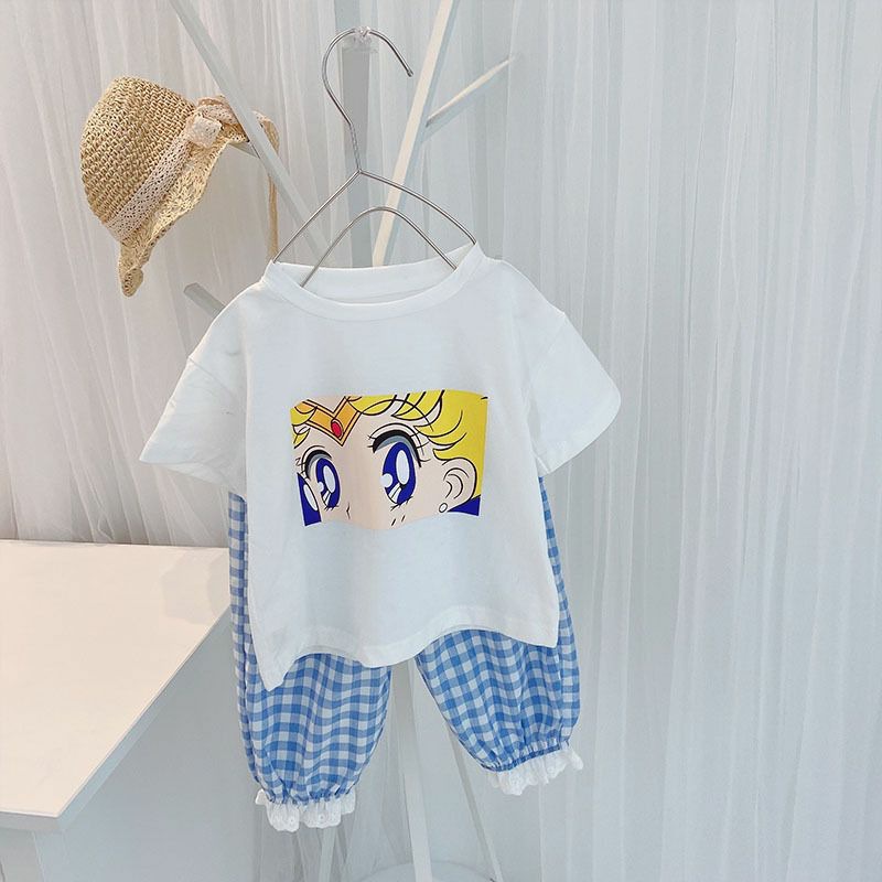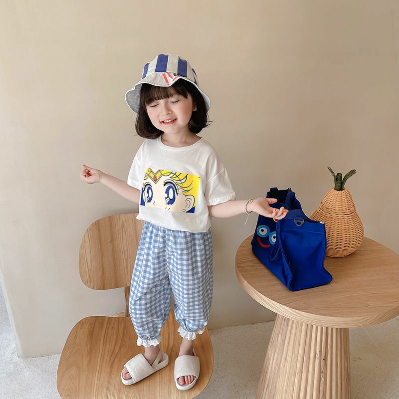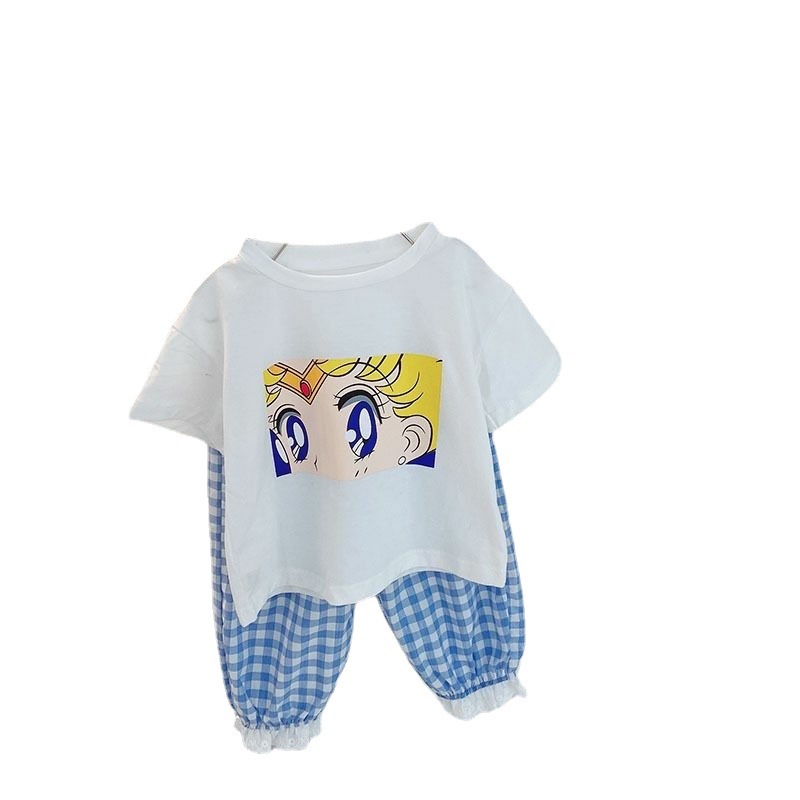 夏季女童套装宝宝洋气儿童个性潮牌外贸INS卡通短袖T恤花边格子裤