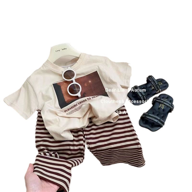 夏季女童网红两件套装宝宝洋气儿童潮韩版个性印花T恤条纹阔腿裤