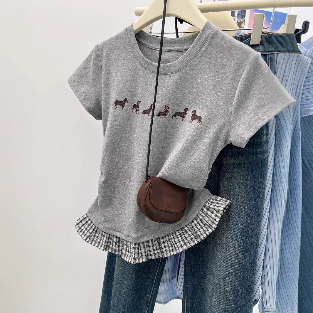 韩系夏女灰色ins小狗收腰花边正肩显瘦短袖T恤