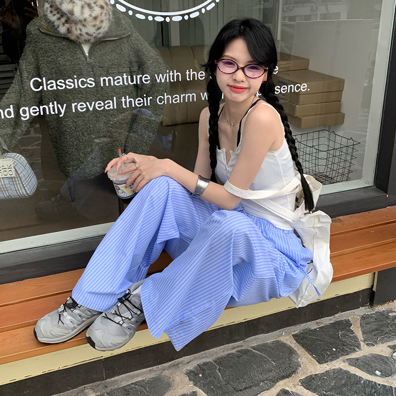 夏季新款清凉遛弯百搭休闲裤女宽松显瘦轻松感条纹蓝休闲裤子