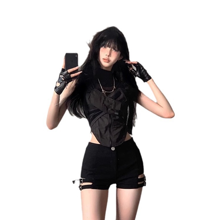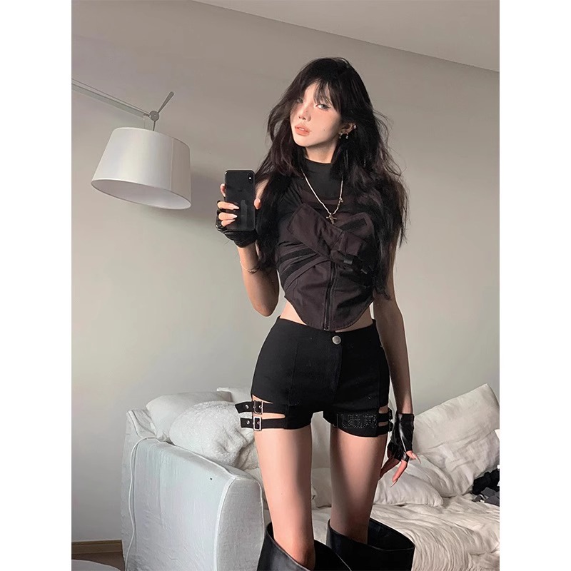 辣妹夏季朋克风短裤女爵士舞黑色机车高腰钢管舞弹力包臀热裤子