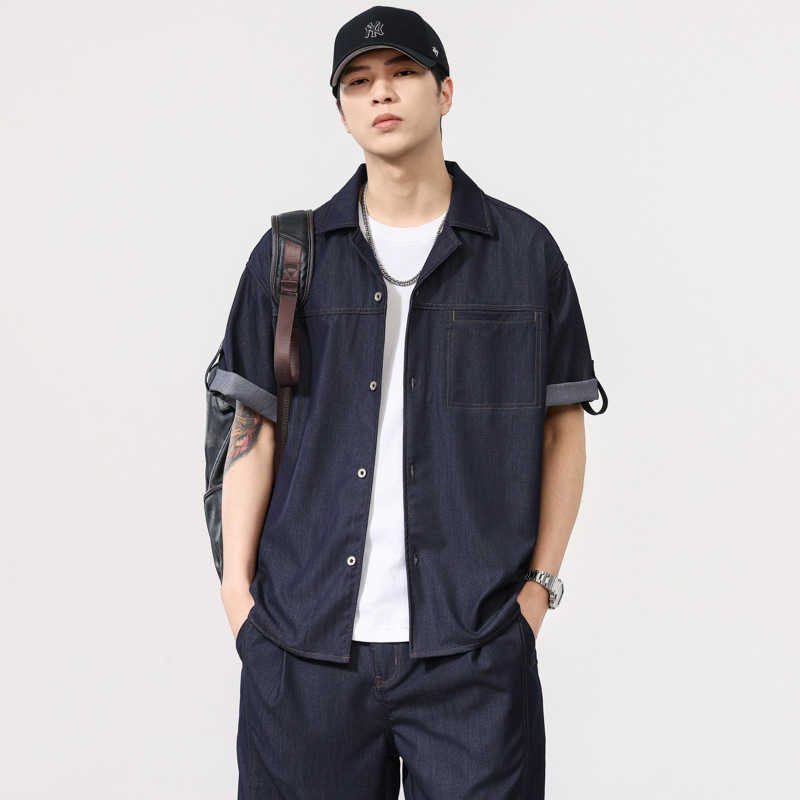 蓝色短袖衬衫男士夏季薄款复古水洗翻领高级感冰丝仿牛仔衬衣