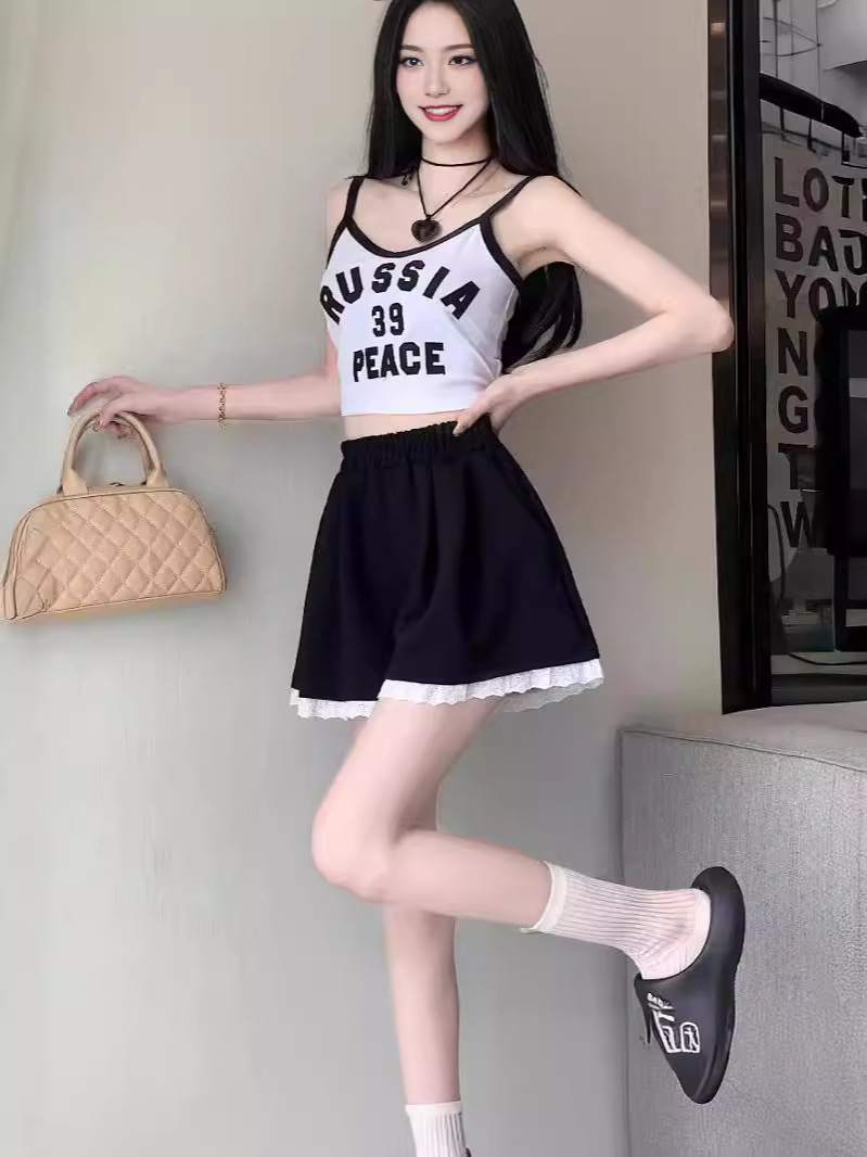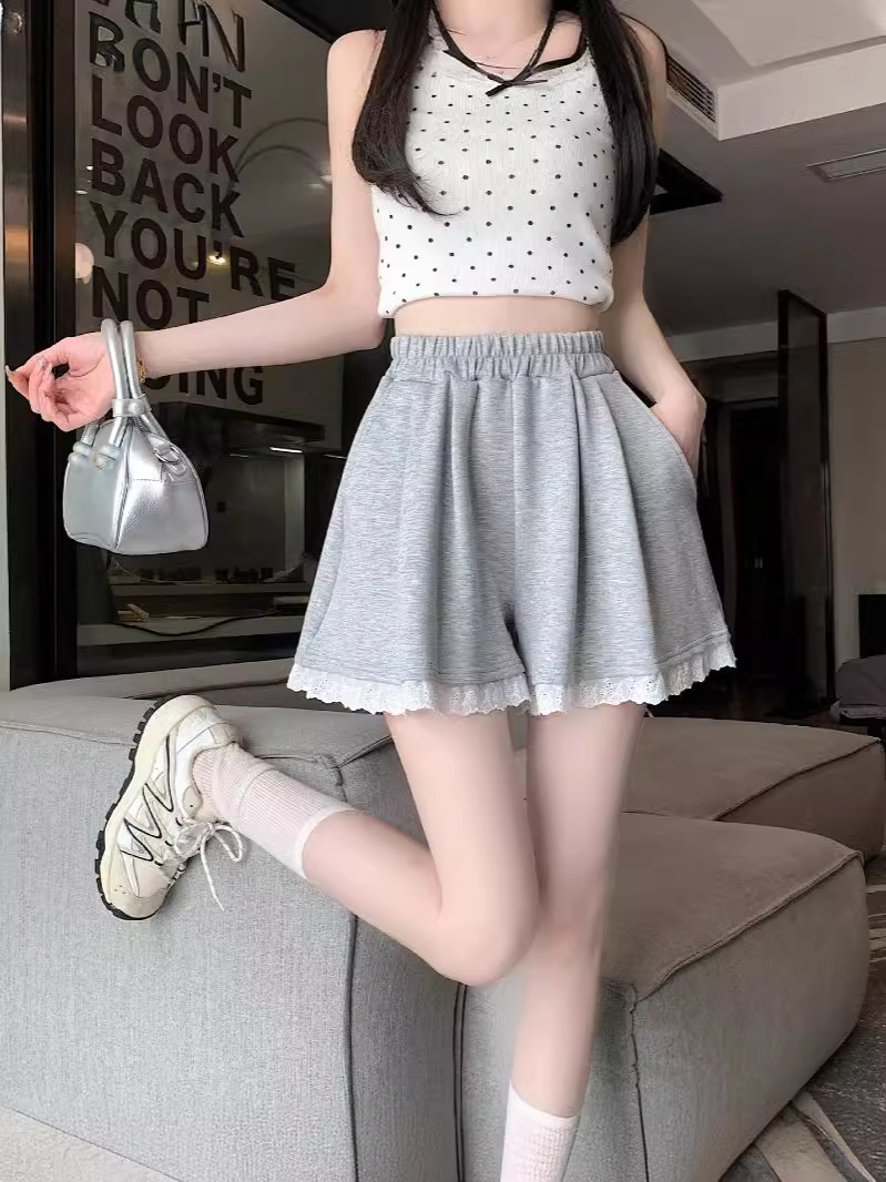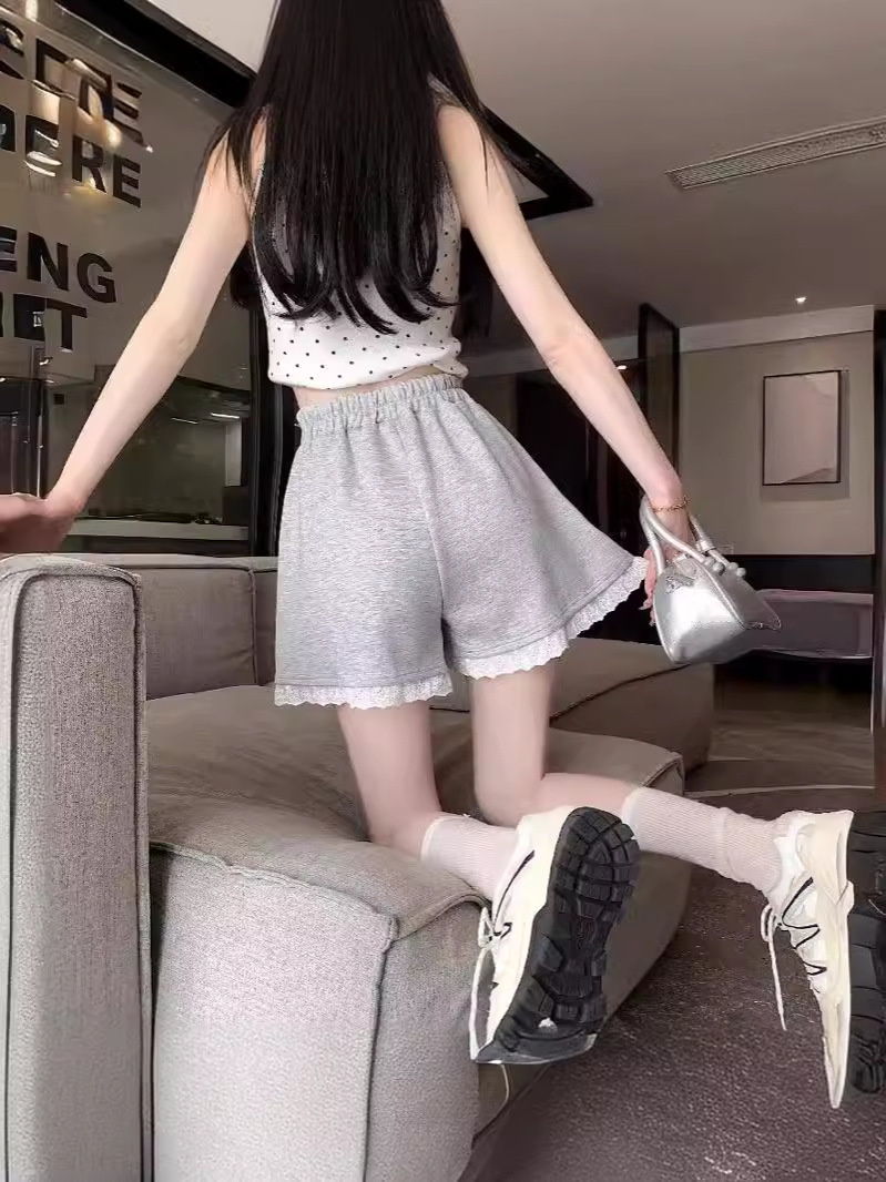 运动短裤女新款韩版宽松蕾丝花边松紧高腰气质休闲a字阔腿裤外穿