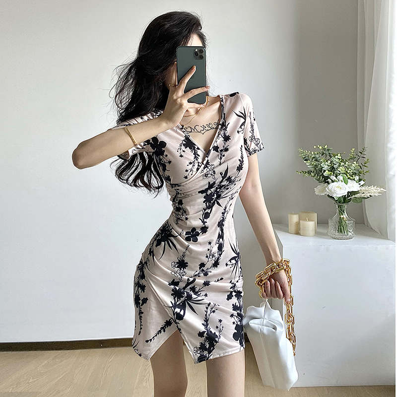 小个子新中式辣妹包臀裙新款V领收腰显瘦短袖印花褶皱连衣裙