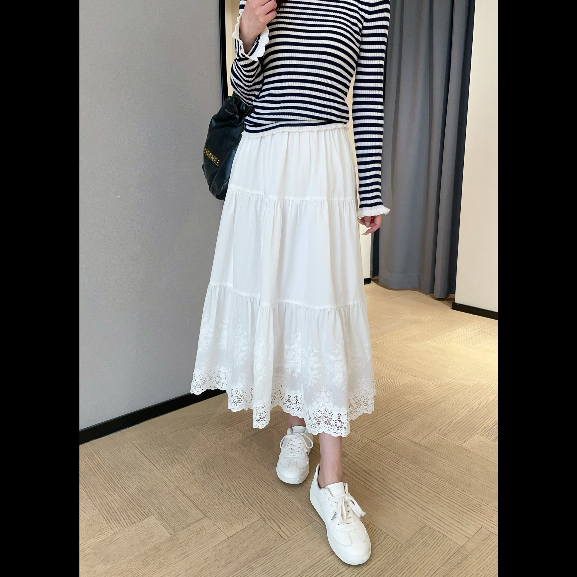 WTHEONE法式蕾丝花边清爽透气半身裙松紧腰显瘦A字裙2025春夏