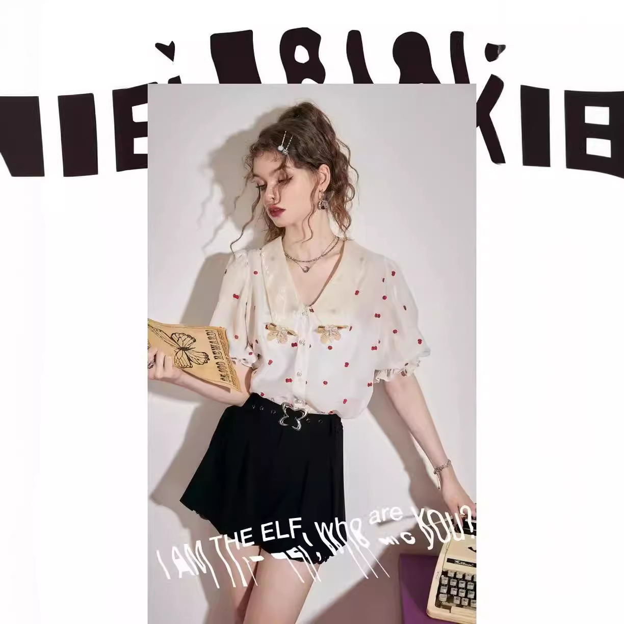 白色波点泡泡袖衬衫女夏季新款短袖薄纱仙气上衣