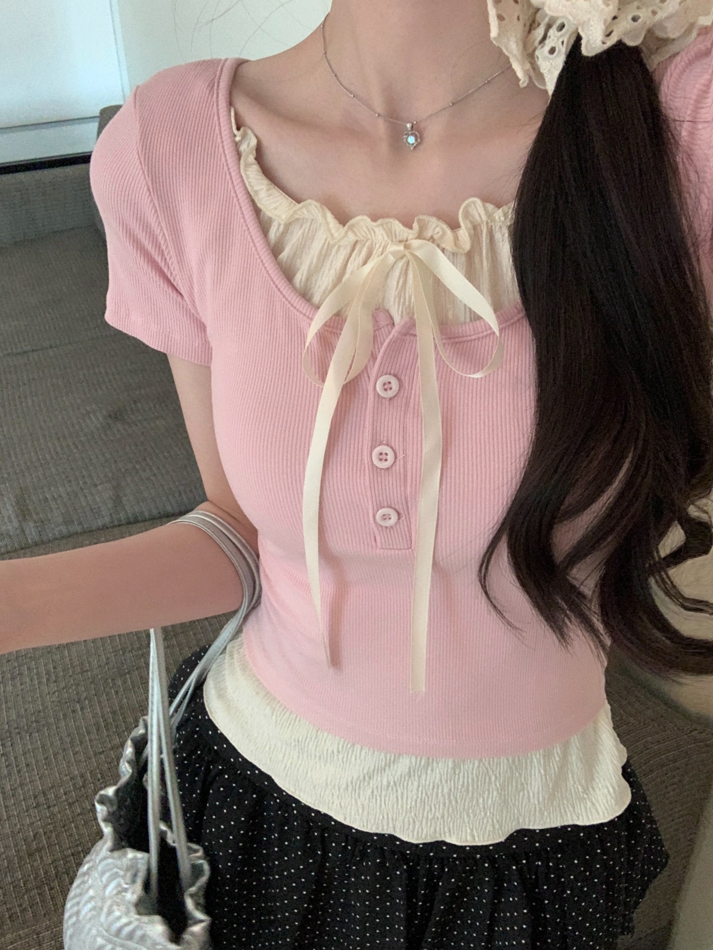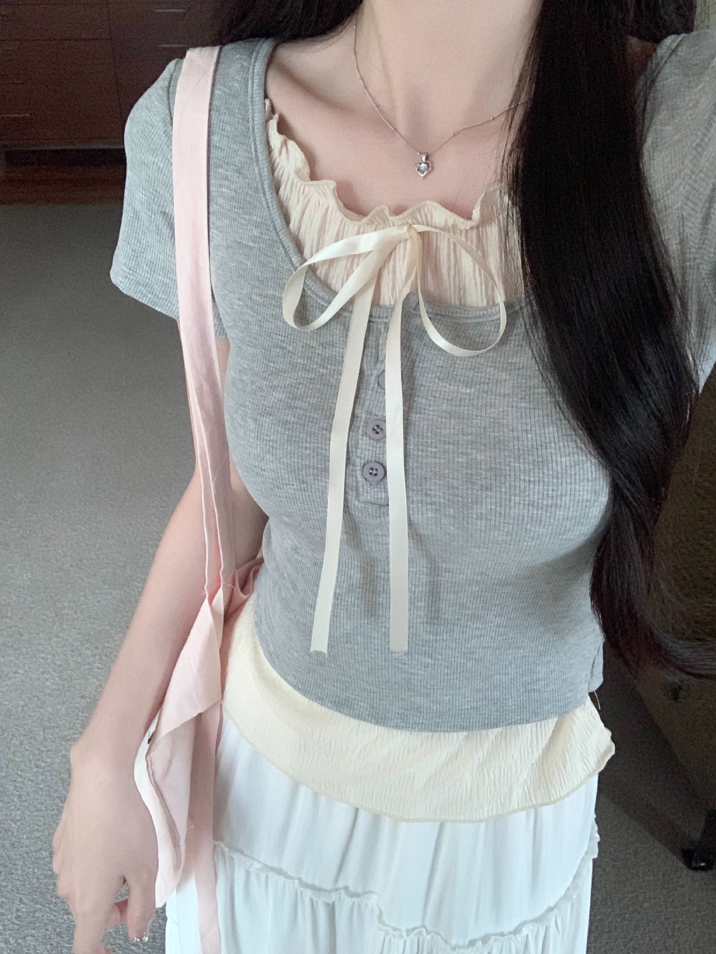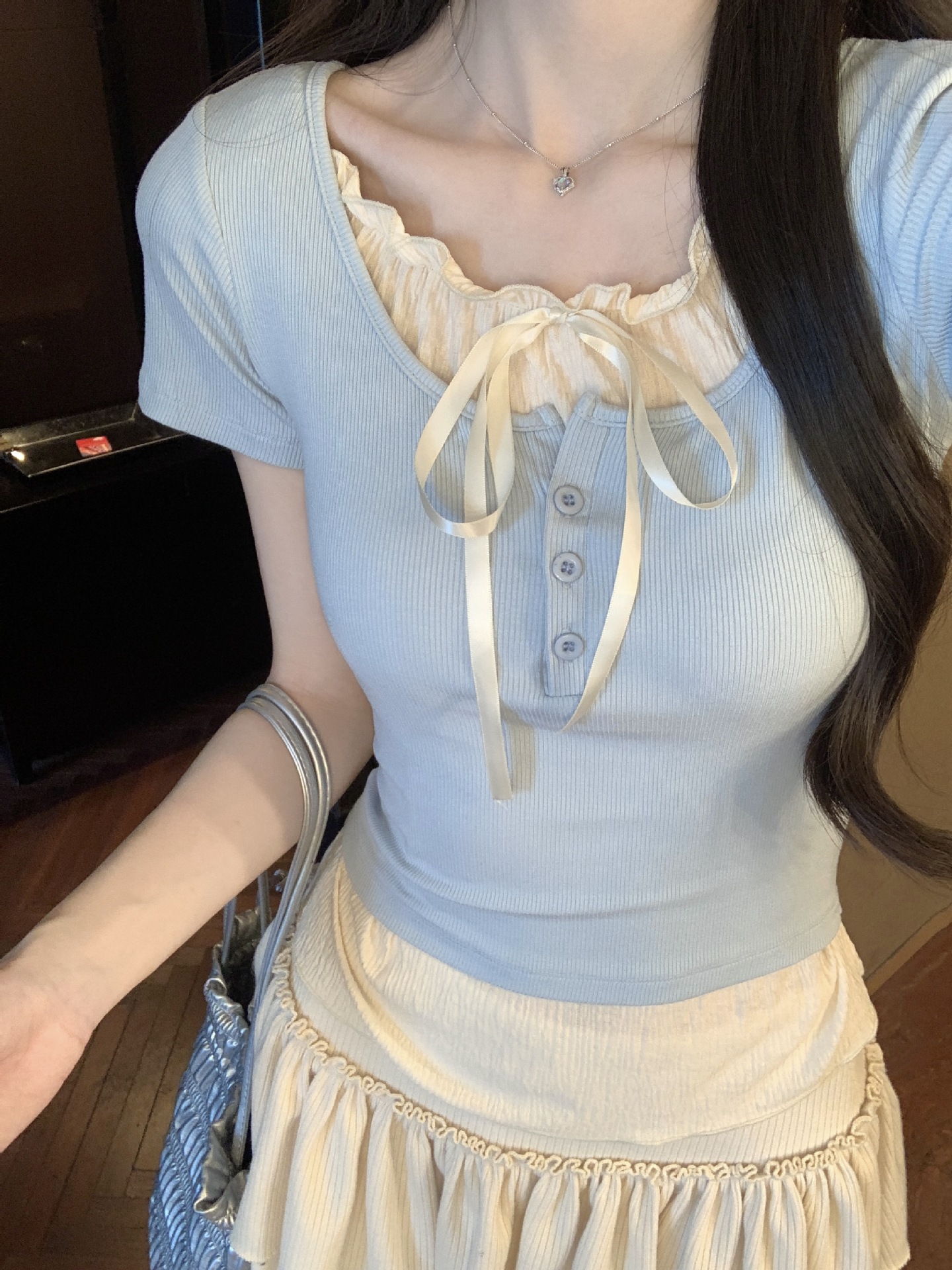 螺纹蕾丝拼假两件短袖T恤女夏季新款韩版修身设计感体恤上衣