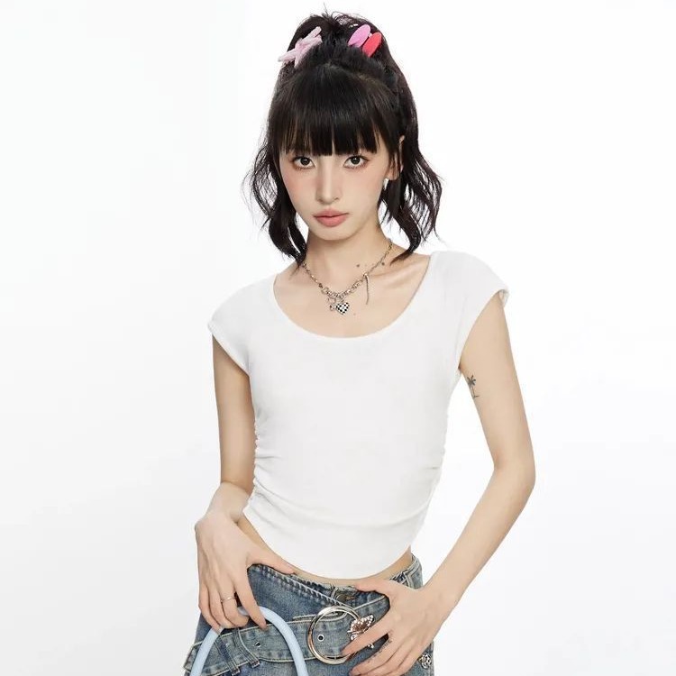 纯欲风U领正肩短袖t恤女夏季新款修身显瘦设计感辣妹短款褶皱上衣