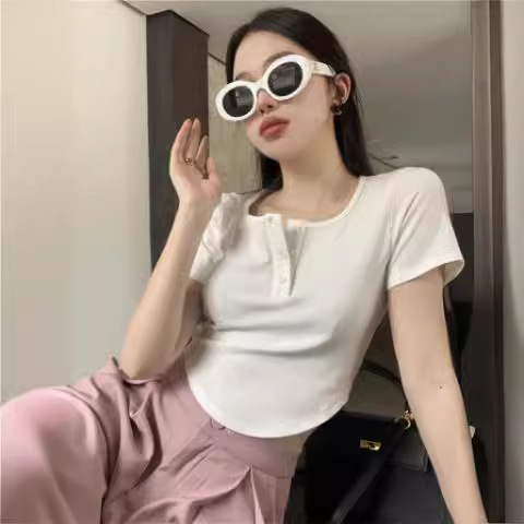 螺纹正肩短袖T恤女夏季2025年新款设计感辣妹不规则弧形短款上衣
