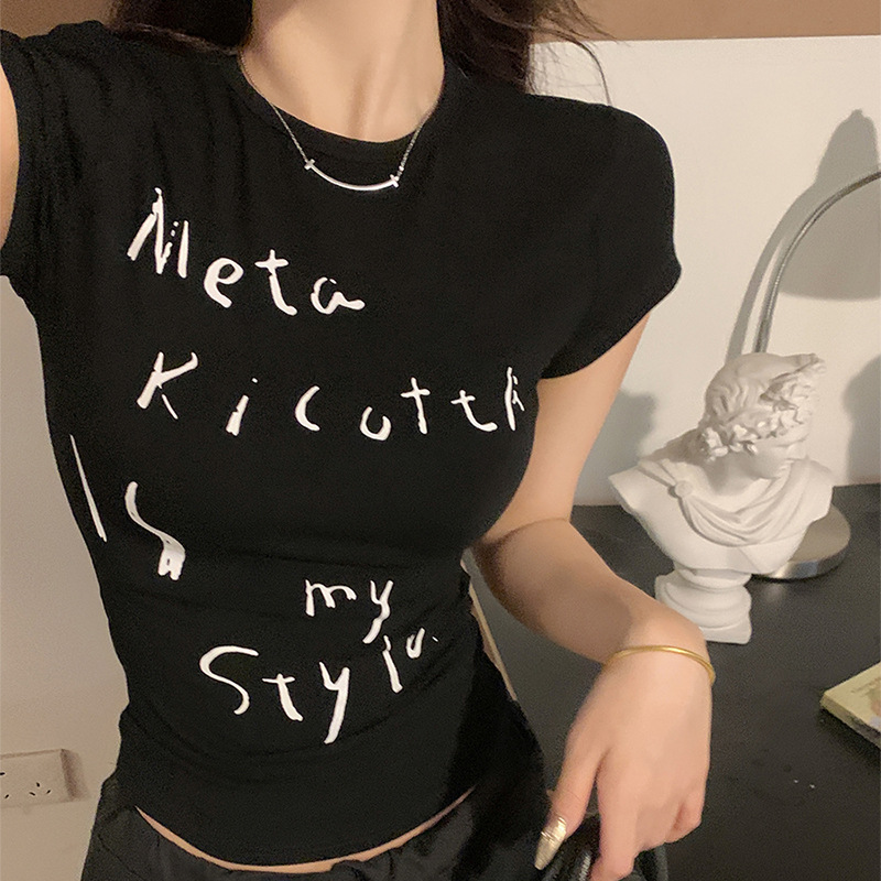 韩系chic别致字母印花正肩短袖T恤女夏季圆领纯棉收腰显瘦小上衣