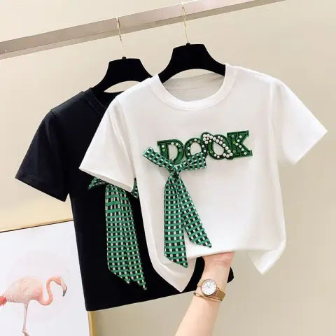 欧货2025年新款爆款宽女装气质体恤小众设计感重工烫钻短袖体恤女