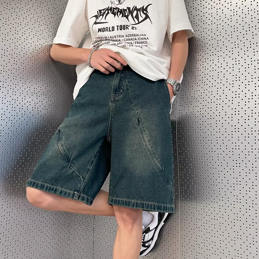 新款欧美高级感蓝色牛仔短裤男美式复古五分裤宽松直筒破洞裤