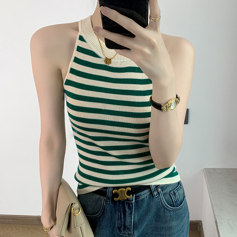 春夏薄款天丝条纹撞色无袖冰感凉爽圆领挂脖背心上衣女