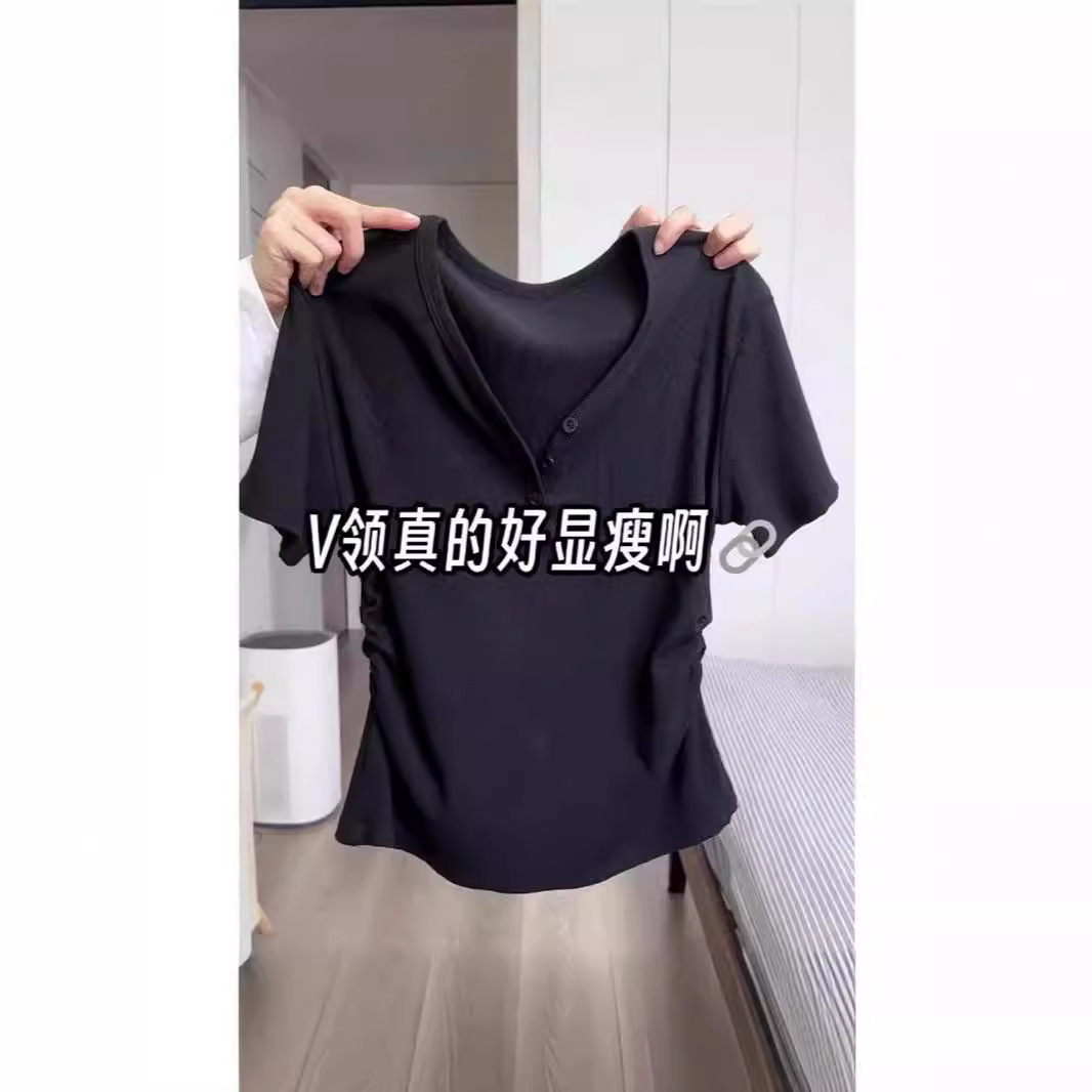 新款坑条不规则正肩短袖t恤女夏季v领上衣服显瘦收腰褶皱独特别致