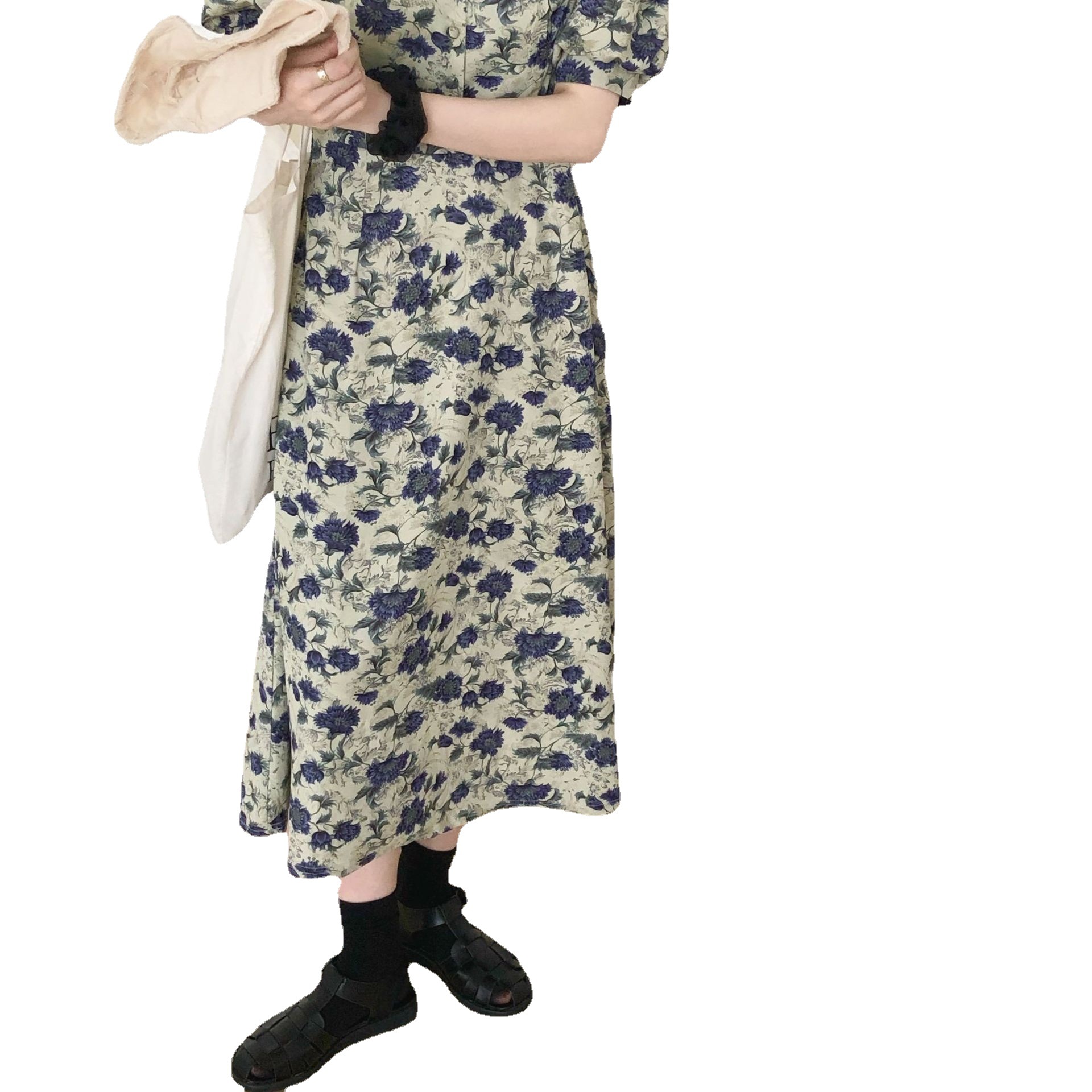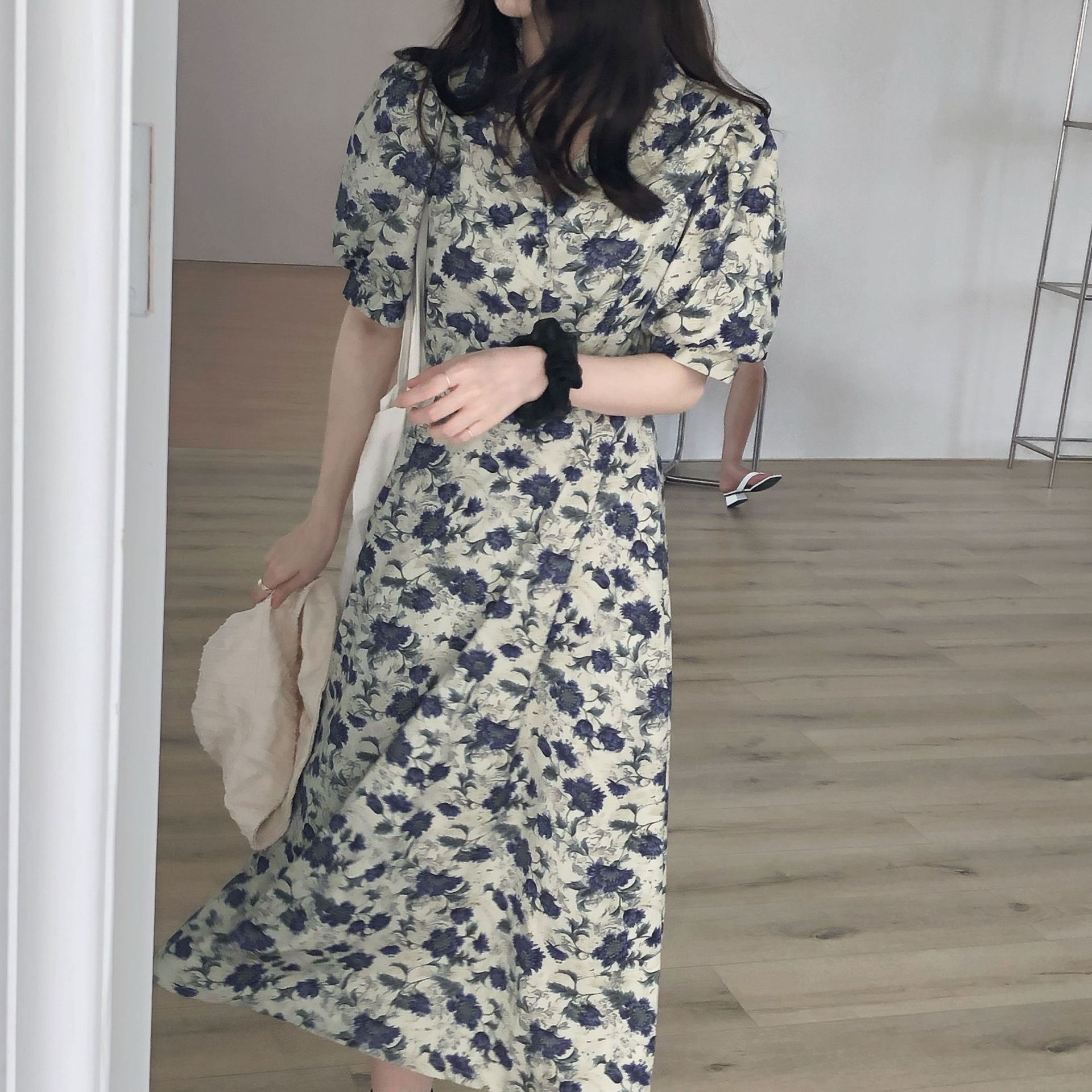 年新款韩版洋气桔梗收腰显瘦气质v领泡泡袖碎花连衣裙女夏季