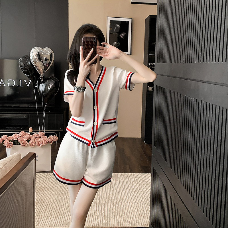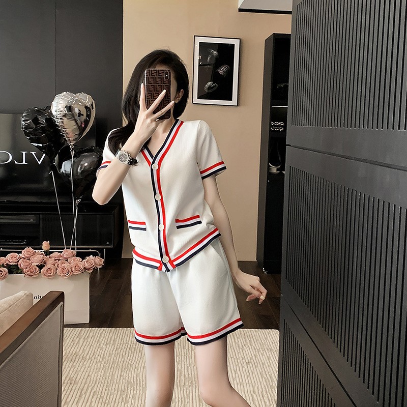 小香风套装女设计感气质短袖上衣女夏季高腰短裤裤子温柔风两件套
