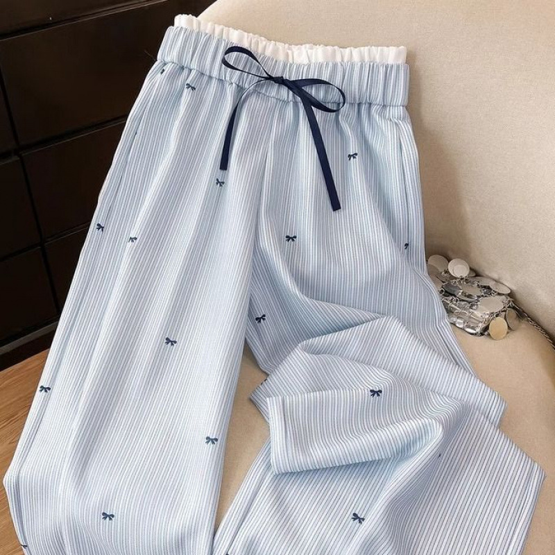 韩系蓝色蕾丝条纹阔腿裤女春夏2025年新款直筒休闲裤设计感长裤子