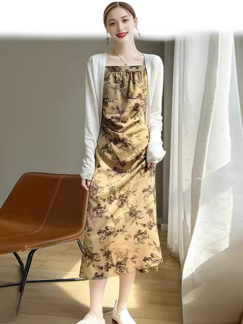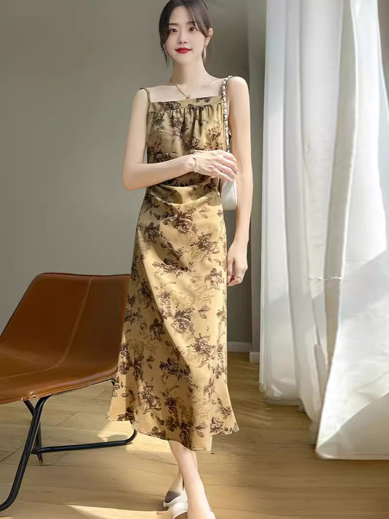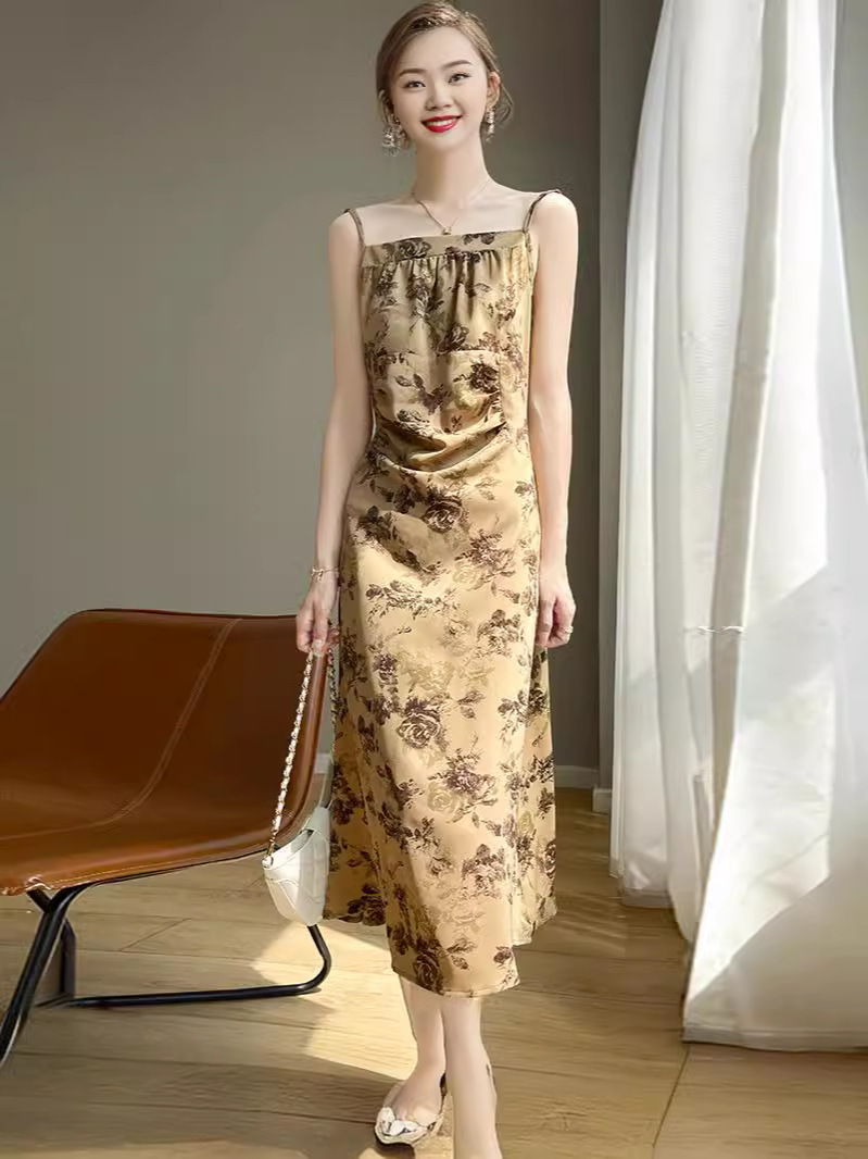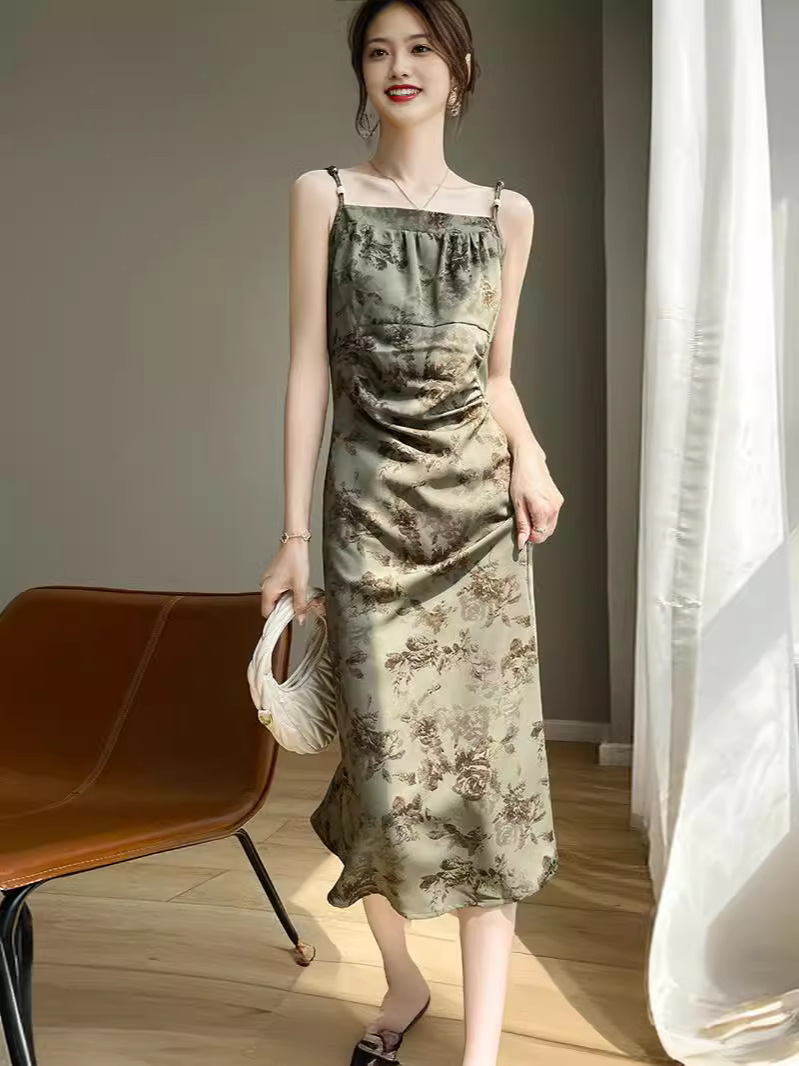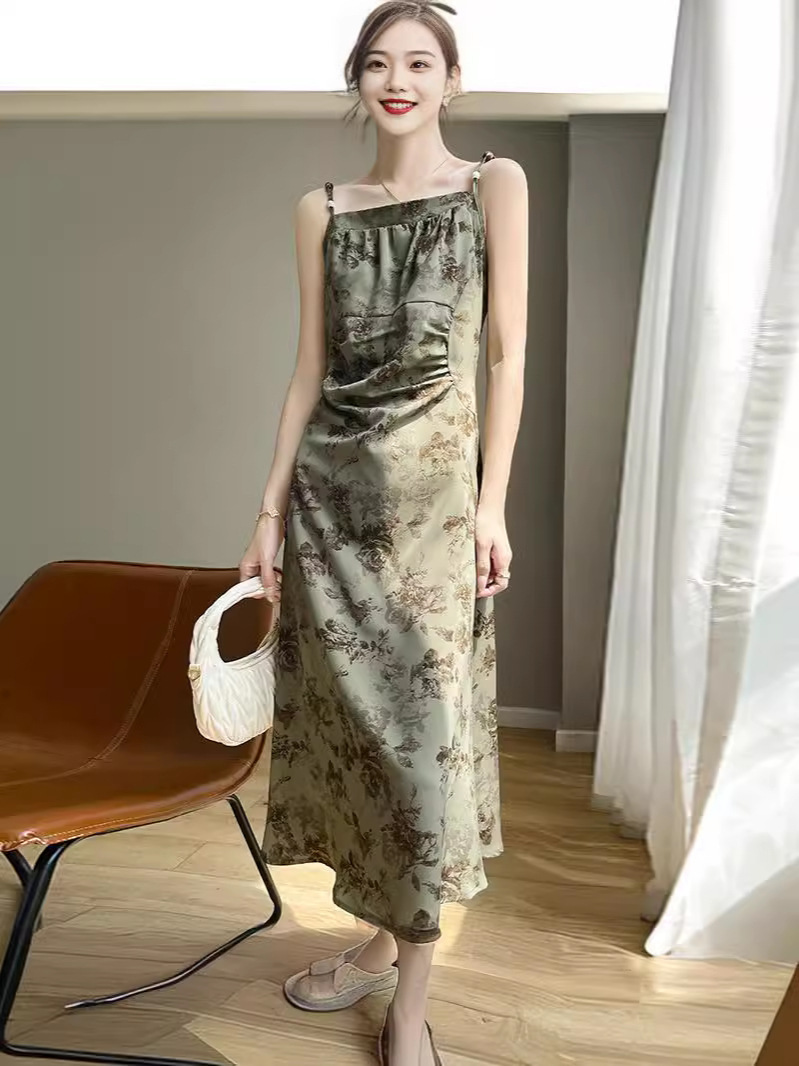 夏季新款法式吊带连衣裙女新中式复古显瘦小众收腰吊带碎花中长裙