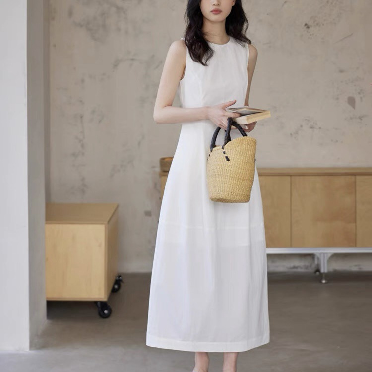法式无袖白色连衣裙女夏拼接收腰黑色领证背心裙花苞长裙