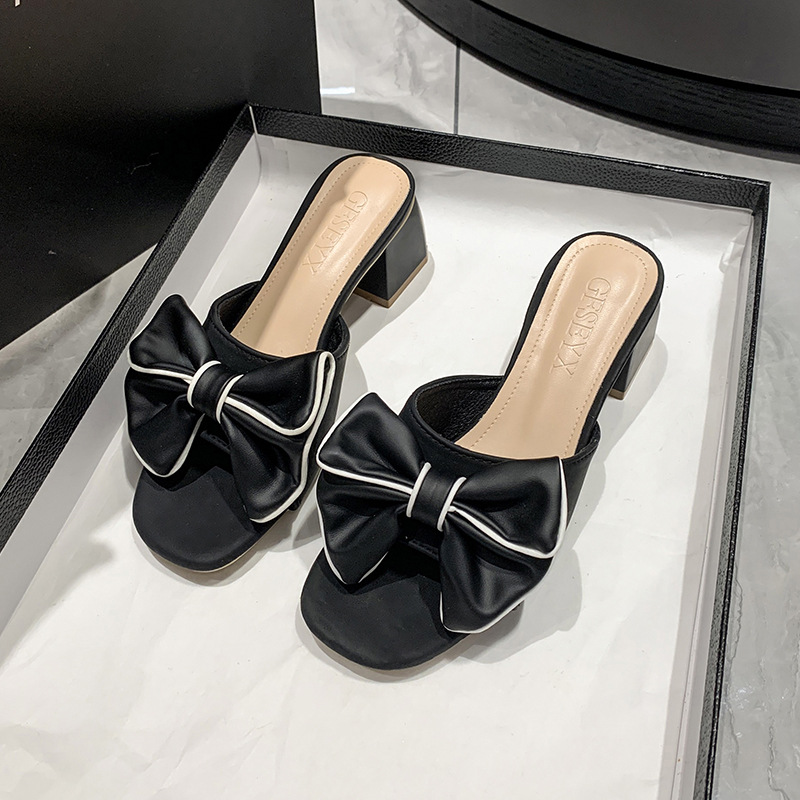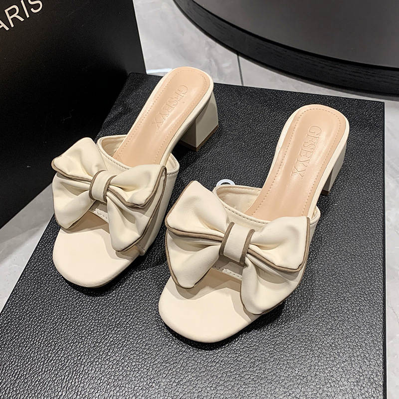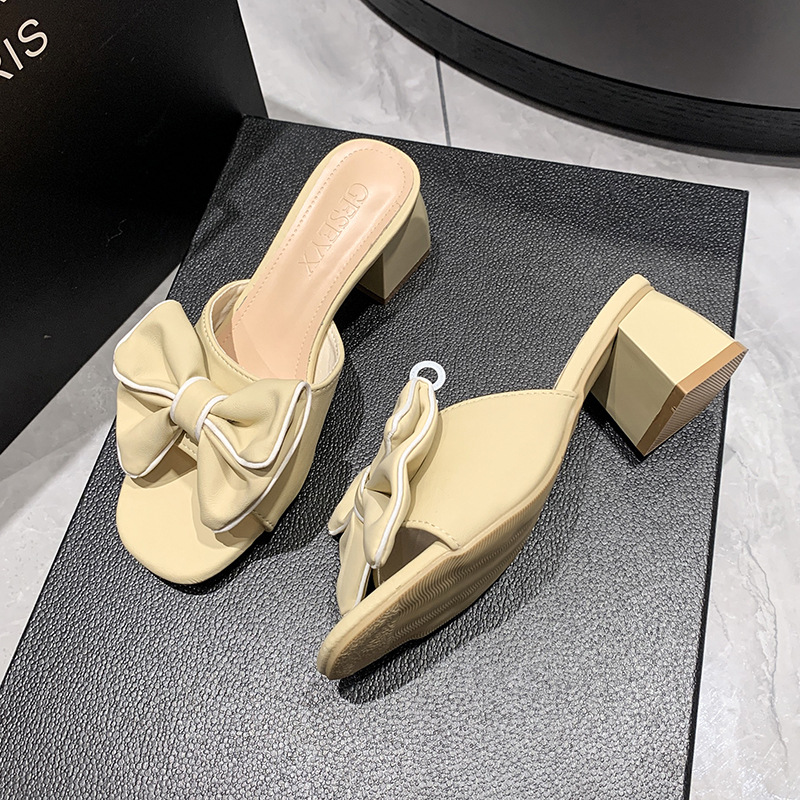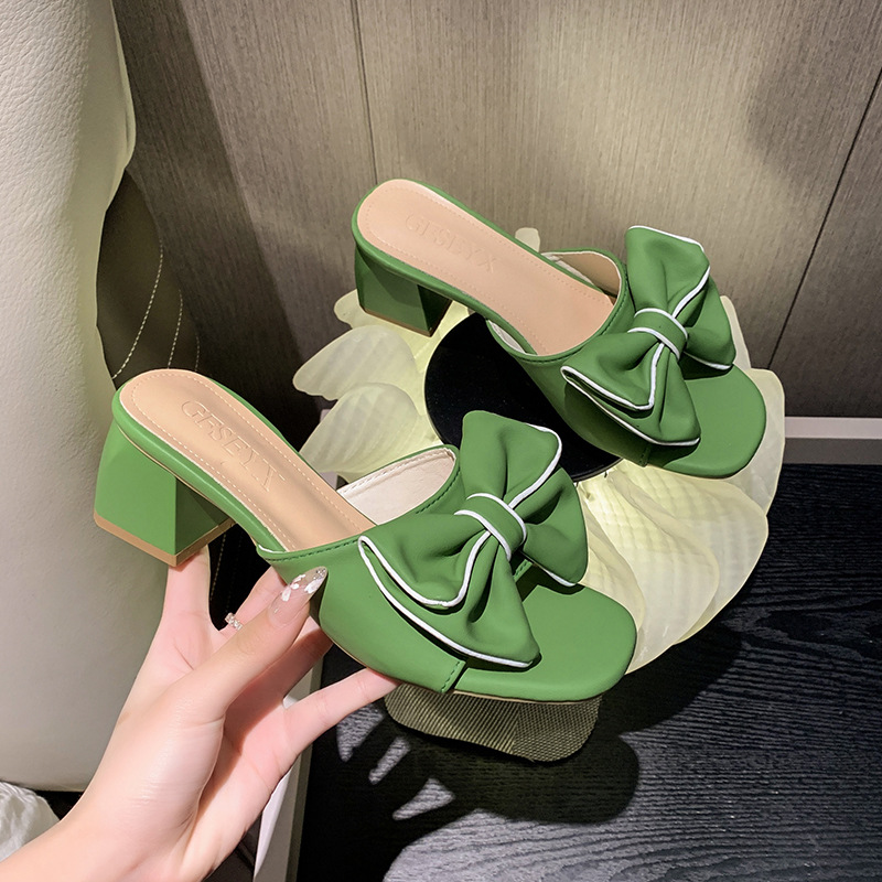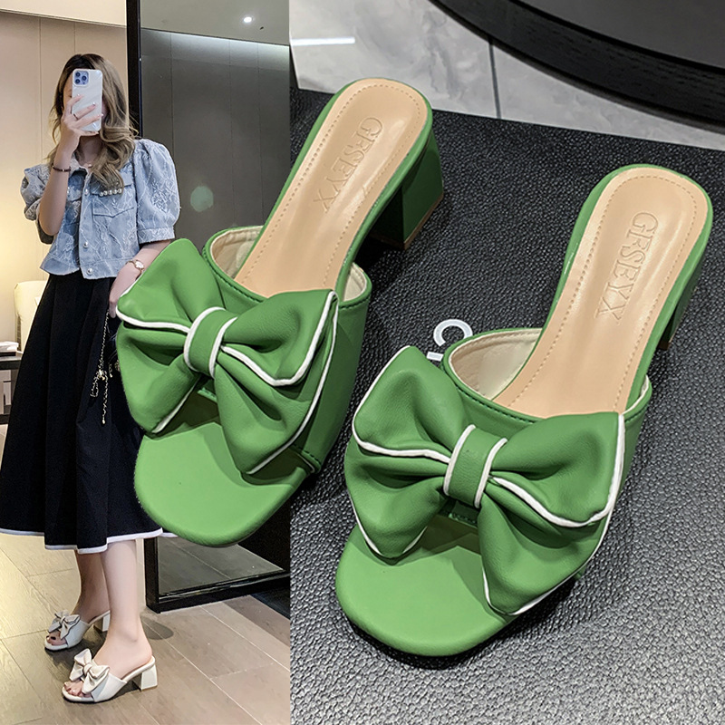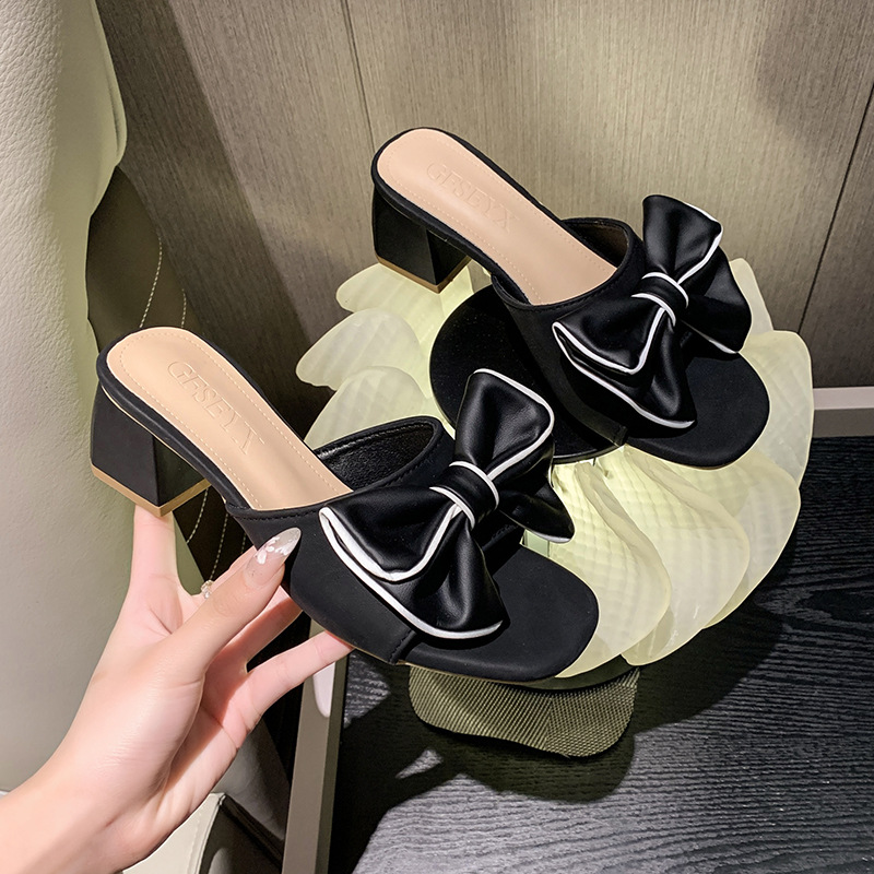 法式大码凉鞋年新款方头高跟鞋中跟粗跟半拖蝴蝶结一字拖外穿